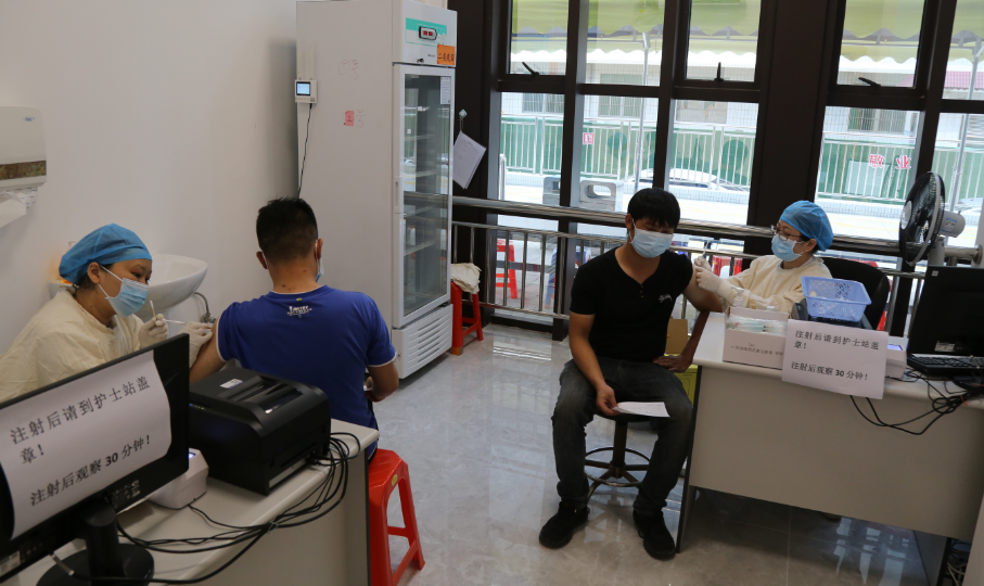 新冠病毒疫苗大型临时接种点”大型标识牌,该大楼一层设有填表候诊区、预检分诊区、咨询区、登记区、接种区、接种凭证盖章区、留观区等8个区域,并在各区域显著位置设置了宣传引导标识、公示等贴心提示。 接种疫苗是预防新冠病毒最有效的途径,目前市中心医院使用的是国产新冠病毒灭活疫苗,免疫程序为接种2针次。 前来接种疫苗的市民在做好个人防护的前提下,在接种区按照流程指引完成疫苗接种后,再进入留观区观察30分钟后即可离开。不少市民表示,整个流程有序快捷,而且医院环境舒适,医护人员服务热情,感到非常安全放心。 为更方便接种疫苗