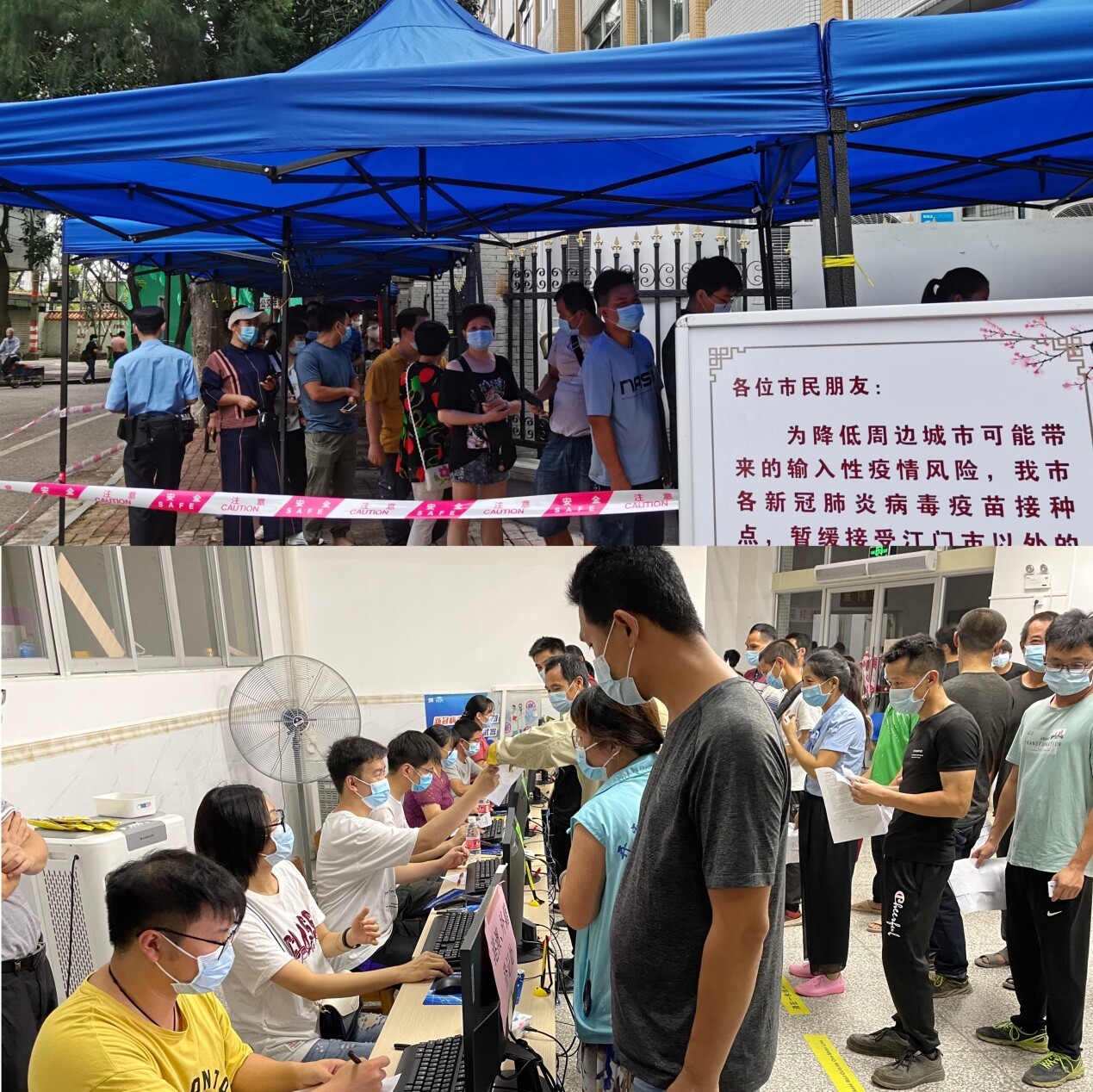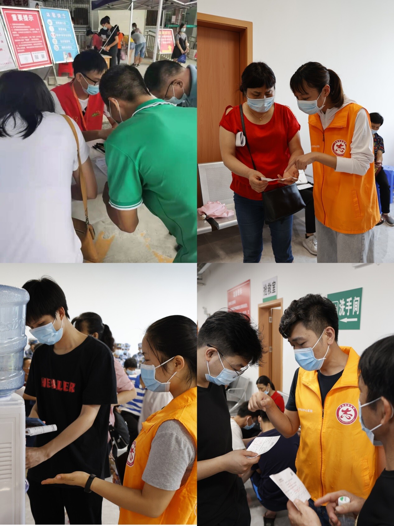 疾控中心工作人员24小时轮守岗位,一旦接到任务即刻启动运输、拣选、追溯码采集、打包、以及出库配送工作,不分昼夜,不惧烈日,确保疫苗不在疾控中心仓库过夜,第一时间安全配送至各接种点,为扎实筑牢全民免疫屏障传递好疫苗接力赛的第一棒。 △市疾控中心对疫苗进行运输、打包、交接及培训工作 医护人员——守土有责、守土担责、守土尽责,让党徽熠熠生辉 疫情就是命令,防控就是责任。疫苗接种工作开展以来,各级党组织迅速响应,充分发挥密切联系群众的独特优势,从市直医院到基层卫生院,均立即组织起疫苗接种的医护队伍。 市中心医院作为承接最大接种任务的单位,迅速组织党员干部当先锋、做表率、勇挑重担、迎难而上。为给群众创造安全、便捷、舒适的接种环境,中心医院启动了应急措施,当机立断,将还未使用的妇儿大楼在短短一周内完成水电线及网线布置并立即投入使用,最多时开设26个接种窗口为群众同时接种,日接种量达5200针次。为避免群众在排队接种时被烈日直射,中心医院连夜搭起了近百米的候诊帐篷和彩钢遮阳连廊,用实际行动践行初心和使命,彰显医疗系统担当和速度,得到了群众的一致认可。 △市中心医院疫苗接种现场 市中医院在接到接种任务后,领导班子高度重视,从接种点的场地布置、接种医务人员的紧急培训、人员调配、市民咨询答疑、接种后留观……每个环节都精心部署。并及时总结经验,优化接种流程,以高度的责任心,确保接种工作接种安全、高效。 △市中医院疫苗接种现场 市妇幼保健院在院领导的统筹部署下,在多个科室抽调精锐骨干快速集结成疫苗接种小组,驻守在疫苗接种点。并严格按照要求科学、合理设置场外身份信息核查区及场内预检、信息录入、接种、留观4个区域。清晰的思路指导高效的工作,妇幼保健院单日最高接种量达1920剂次。 △市妇幼保健院疫苗接种现场 各镇基层卫生院在疫苗接种工作中起到了至关重要的作用,承接了全市超过50%的接种任务。镇政府与医疗卫生单位联动,各镇政府组织领导到位、宣传引导到位和精准发动到位,卫生院做好疫苗的解释、注射和留观工作。基层疫苗接种工作顺利有序开展。 △卫生院疫苗接种现场 公安干警——立足本职,主动担当,护航疫苗接种有序进行。 在疫苗接种第一线,与医务人员同坚守的还有我们最可爱的公安干警们。从疫苗接种工作开始以来,公安部门组织人员与疫苗接种点进行对接,严格按照接种时间及时调派警力,维持现场秩序,确保疫苗接种现场绝对安全、稳定,接种工作有序、顺利。 △公安干警安保工作现场 志愿者——“疫”站到底,默默无闻的最强守护 “逆水行舟用力撑,一篙松劲退千寻”,战“疫”路上,党员志愿者永不缺席。在疫苗接种的第一线,在排队等候区、填表区、接种区、留观区,随处可见身披橙色马甲的志愿者们,他们中有热心公益事业的社会人员,也有刚刚下夜班的医护人员。志愿者们各司其职,积极参与疫苗接种服务引导、秩序维护等工作,为接种者提供人性化、针对性的服务,保障疫苗接种有序进行。 △志愿者们忙碌在各自的岗位 模糊了白天和黑夜,模糊了工作日和节假日是抗疫人员最真实的状态。即便是这么大的工作量,没有一个人有怨言,没有一个人提条件,都在与时间赛跑,这是对岗位的坚守,更是广大党员干部的初心使命!