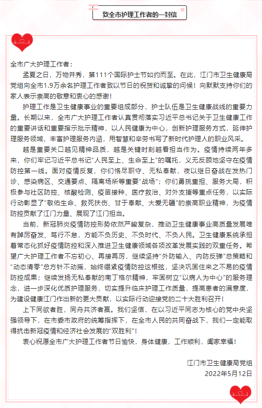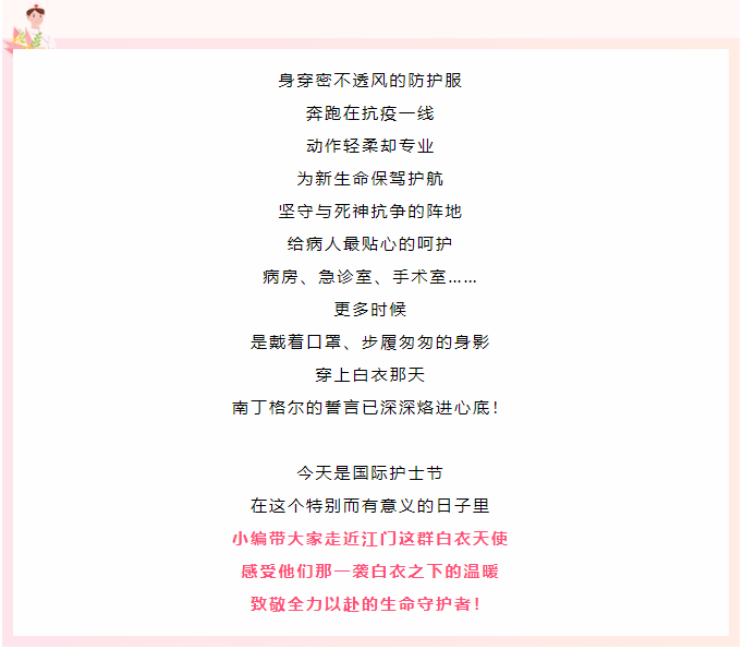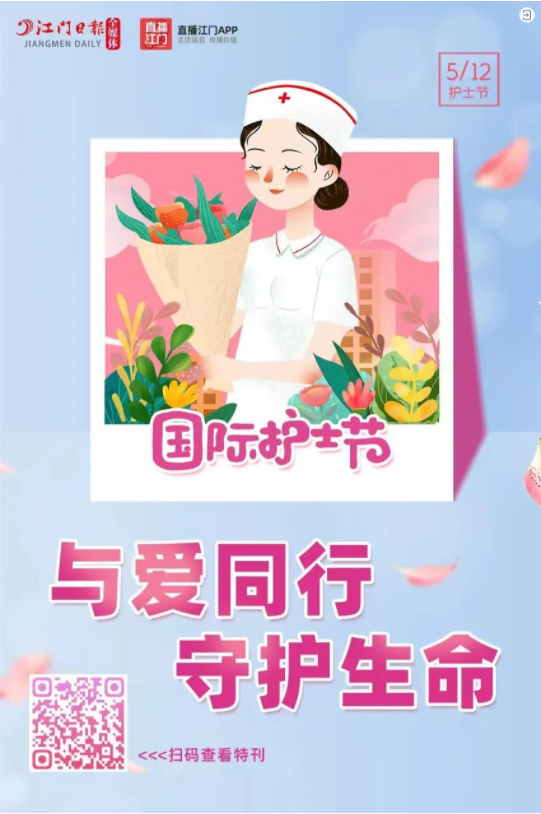 今天,向你们说一声:“节日快乐!” 你们 平凡而辛苦 平凡而专业 平凡而伟大 你们 夜以继日辛劳的汗水里 把平凡演绎成无数精彩 感谢你们 用生命守护生命 致敬 每一位护理工作者 有你们,真好! (点击图片跳转观看视频) 5·12国际护士节 祝所有白衣天使们 护士节快乐! 世界因你多温暖 向默默奉献的白衣天使 致以最崇高的敬意 护士节快乐 来源:开平发布 来源:健康江门 今天, 《江门日报》特推出 “与爱同行 守护生命 ——国际护士节特辑”。 扫描下方图片二维码,查看精彩报道! ↓↓↓ 制图/陈慧君 过去一年 江门市共有19168位“你” 默默守护大家的健康 坚毅、勇敢、智慧 温暖、专业、奉献 没有生而无畏 只是选择英勇 感谢你们用生命守护生命 让我们一起向这群 可爱又坚强的白衣天使们道声 辛苦了! 节日快乐! 来源:江门发布综合整理