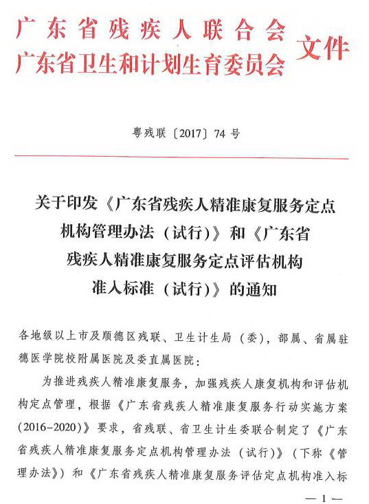 《广东省残疾人精准康复服务定点机构管理办法(试行)》和《广东省残疾人精准康复服务定点评估机构准入标准(试行)》