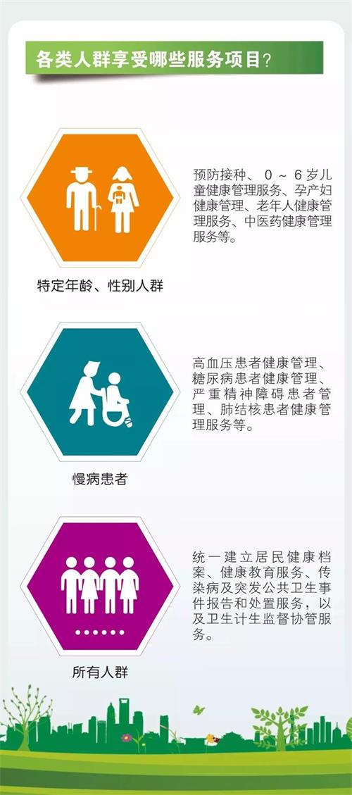 信息来源:国家卫生健康委员会 爸爸妈妈去社区做体检、宝宝按时打预防针......都是我们生活中习以为常的事情。 但是你知道吗?其实这些都是国家基本公共卫生服务项目! 从出生开始国家基本公共卫生服务项目就始终在给予我们保障,传递关爱的同时TA还能让你免费享受周到的服务呢! 那么,基本公共卫生服务项目具体有哪些呢? 1、居民健康档案 2、健康教育服务 3、预防接种服务 4、儿童健康管理服务 5、孕产妇健康管理服务 6、老年人健康管理服务 7、慢性病患者健康管理(高血压、2型糖尿病) 8、严重精神障碍患者管理 9、传染病及突发公共卫生事件报告和处理服务 10、卫生计生监督协管服务 11、中医药健康管理服务 12、结核病患者健康管理服务 2019年国家基本公共卫生服务项目又新划入了19项哦!