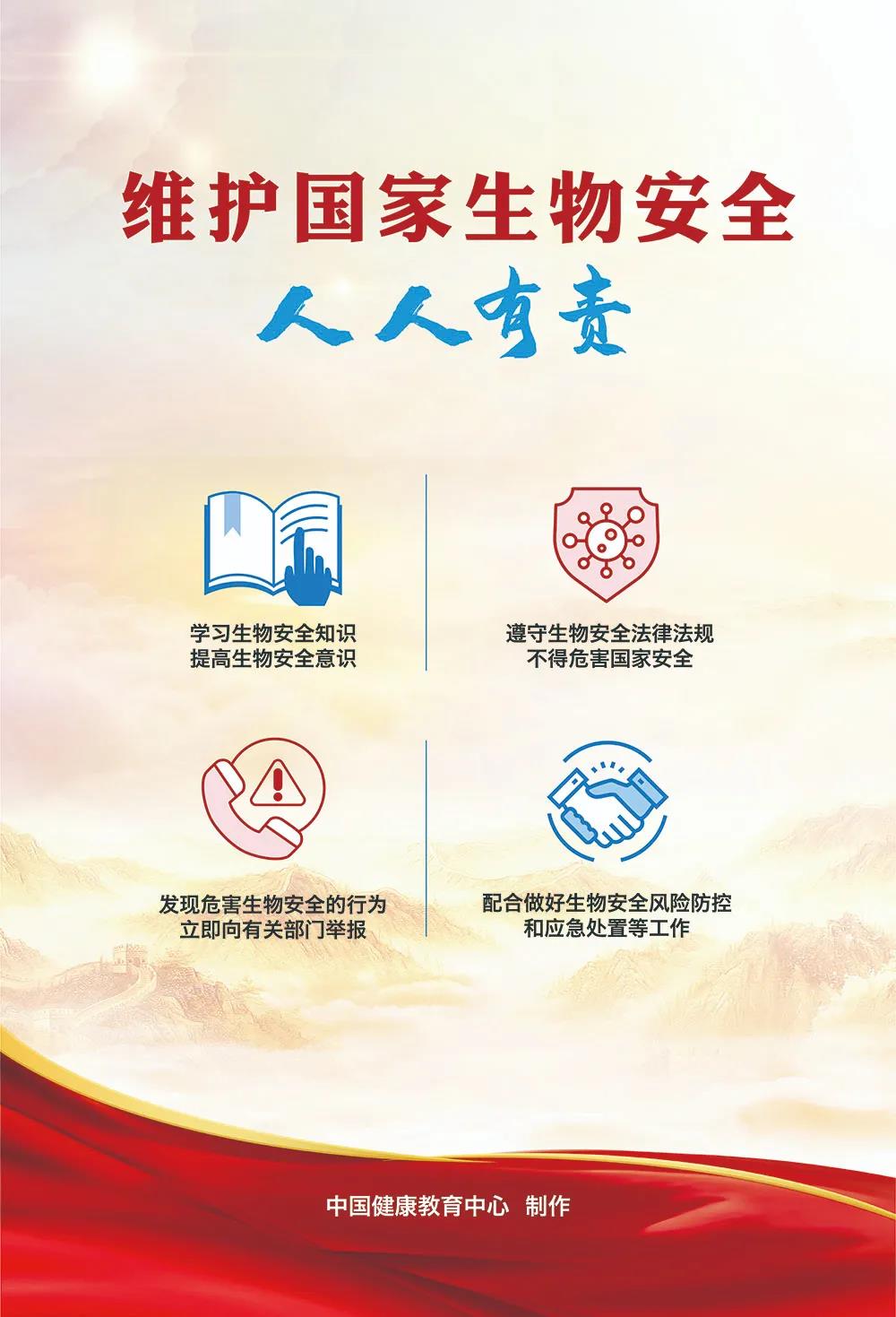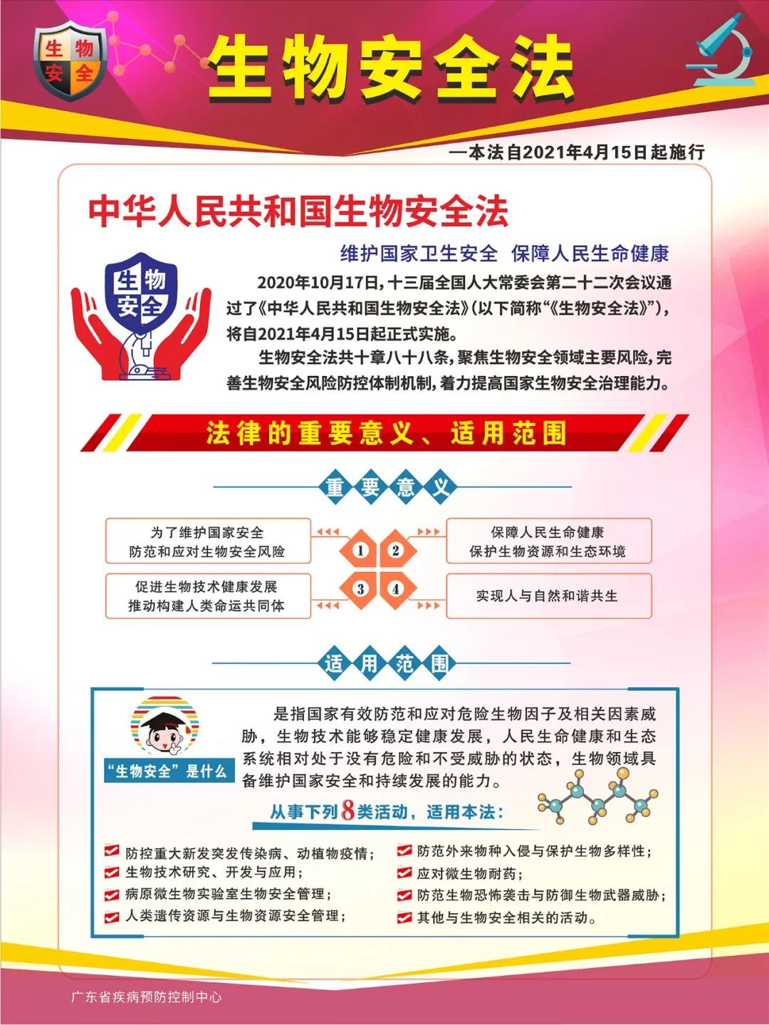 信息来源:中国健康教育中心、广东疾控4月15日是第六个全民国家安全教育日,也是《中华人民共和国生物安全法》(以下简称《生物安全法》)实施日。2020年2月14日,习近平总书记在中央全面深化改革委员会第十二次会议中发表重要讲话:“把生物安全纳入国家安全体系”、“要尽快推动出台生物安全法”,为《生物安全法》的出台指明了方向。下面6张海报一起来学习《生物安全法》吧↓↓↓