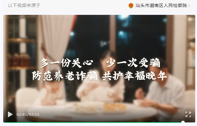 来源:广东政法【阅读原文】 综合自:汕头检察、顺德区人民法院、江门政法、潮州政法 为加大打击整治养老诈骗专项行动宣传力度,持续营造强大舆论声势,连日来,广东各地各成员单位创新宣传内容和形式,推出了一批主题鲜明、创作新颖、直观生动的新媒体作品,围绕养老诈骗的危害性、迷惑性、欺骗性开展宣传,帮助老年人群体提高法治意识和识骗防骗能力,切实维护好老年人的合法权益。 近年来,以销售“保健产品”“养老理财”等为名的养老诈骗手法层出不穷,掏空了老人用来安享晚年的“钱袋子”。为加强宣传力度,汕头市潮南区人民检察院制作防范养老诈骗微视频,揭露诈骗套路手法,帮助老年人提高法治意识和防范诈骗的能力。 老人没买社保,担心会增加孩子压力,忧心忡忡之下,“干儿子”提出认识社保局的工作人员,可以一次性代缴养老保险……快看看佛山市顺德区人民法院根据真实案例改编制作的微视频,提醒老人转账要当心,熟人诈骗更要防。 理性选择养老服务,警惕非法集资陷阱。近日,江门市公安局新会分局推出原创“沙画”——《守好钱袋子 护好幸福家》,转给身边的老年人,教他们识破养老诈骗骗局,远离诈骗! 不法分子假借免费体验、养生讲座、专家义诊、消费返利等方式,夸大保健品治疗功效,欺骗诱导老年人高价购买保健品和保健服务,甚至销售伪劣产品,对老年人身心健康造成严重伤害。潮州市潮安区委政法委、潮州市公安局潮安分局联合制作的反诈木偶小品《真真假假》,提醒老人不要相信诈骗分子所说的“神丹妙药”,任何宣称包治百病、药到病除的“神药”都是欺诈行为。 中央政法委在12337智能化举报平台开通“养老诈骗”举报通道 2.广东省委政法委接收书面举报,邮寄地址:广州市越秀区新河浦合群三马路29号省打击整治养老诈骗专项行动办公室,邮政编码:510082。 【举报渠道】 1、江门市接收举报渠道 邮寄地址:江门市蓬江区白沙街道农林西路70号江门市打击整治养老诈骗专项行动办公室,邮政编码:529000 举报电话:110 2、各县(市、区)接收举报渠道 (1)蓬江区 邮寄地址:江门市蓬江区天河东路20号—8号楼蓬江区打击整治养老诈骗专项行动办公室,邮政编码:529000 举报电话:0750-3213396(法定工作日上午8:30-12:00,下午2:30-5:30) (2)江海区 邮寄地址:江门市江海区东海路338号政法大楼江海区打击整治养老诈骗专项行动办公室,邮政编码:529000 举报电话:0750-3862133(法定工作日上午8:30-12:00,下午2:30-5:30) (3)新会区 邮寄地址:江门市新会区同庆路1号新会区打击整治养老诈骗专项行动办公室,邮政编码:529100 举报电话:0750-6654813(法定工作日上午8:30-12:00,下午2:30-5:30) (4)台山市 邮寄地址:台山市台城街道五福路1号台山市公安局刑侦大队,邮政编码:529200 举报电话:0750-5612114(法定工作日上午8:30-12:00,下午2:30-5:30) (5)海棠直播
