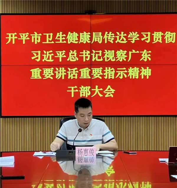 4月24日,市卫生健康局召开党组(扩大)会议,传达学习习近平总书记视察广东重要讲话、重要指示精神。市卫生健康局党组成员、副局长杨惠俊主持会议。市卫生健康局各分管领导、各股室负责同志参会。 会议强调,卫生健康系统要深刻铭记总书记对广东人民的关心关爱、对广东工作的勉励指导,深刻认识习近平总书记视察广东重要讲话、重要指示的重大意义,深刻领会习近平总书记视察广东重要讲话、重要指示的丰富内涵和实践要求,深刻领会总书记对广东作出的新定位,以更为艰辛的探索、更加艰苦的努力,坚决完成好在推进中国式现代化建设中走在前列的使命任务。 会议要求,要把学习宣传贯彻工作摆上重要位置,推动学习宣传贯彻工作不断往深里走、往实里走。一是要领导带头示范学。二是要基层组织分类学。三是要宣传引导深入学。四是要调查研究实践学。以学促干有力有序推动各项任务落地落实。 会议强调,贯彻落实习近平总书记的重要讲话、重要指示精神,要以政治建设为统领,不断提高党的建设质量,为全面推进卫生健康高质量发展提供引领和保障。一是要坚持党的全面领导。二是要认真开好主题教育。三是要加强干部队伍和基层党组织建设。四是要深入推进党风廉政建设和反腐败斗争。 会议强调,要坚定不移贯彻新发展理念,坚定不移推动卫生健康高质量发展。一是要坚持以人民为中心的发展思想,尽力而为、量力而行,积极办好民生实事,推进健康开平建设。二是要聚焦高质量发展目标。三是要聚焦疫情防控新阶段要求。四是要聚焦重点民生工作任务。