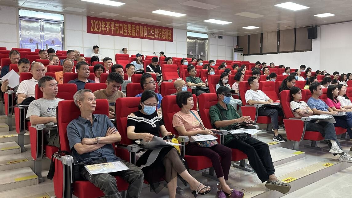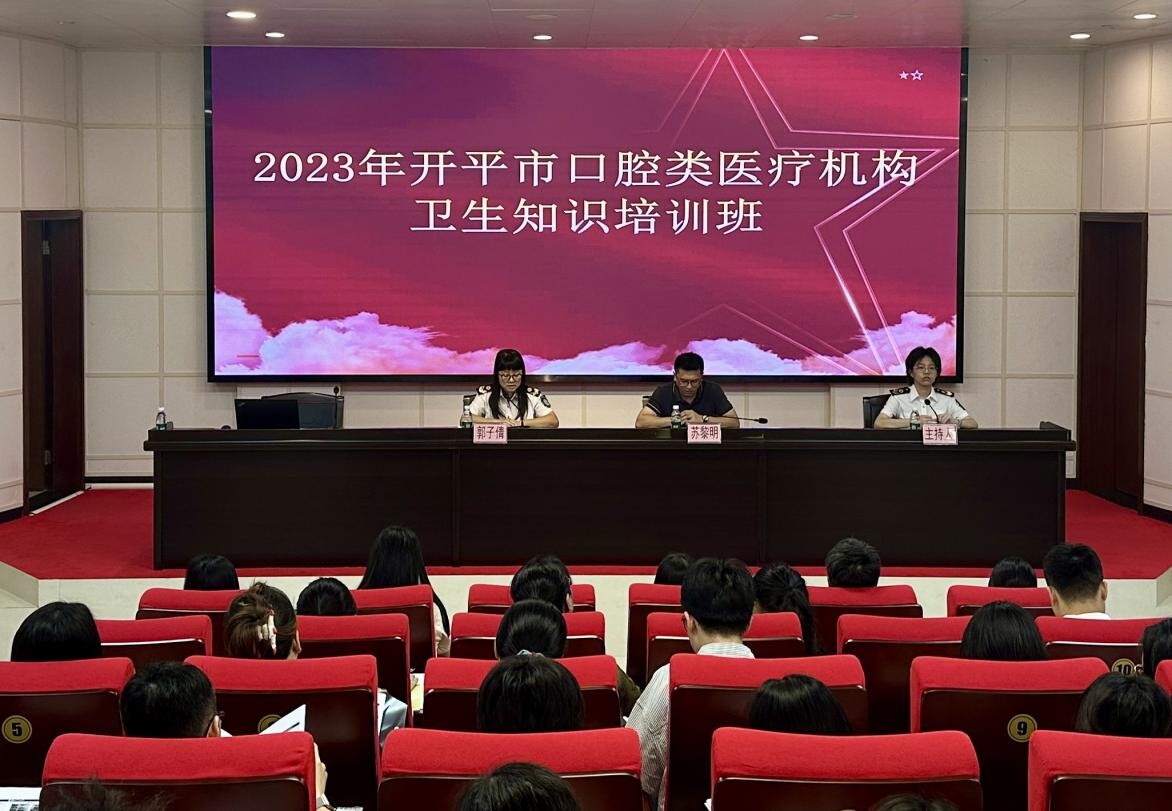 口腔类医疗机构卫生知识培训班。 培训班上,市卫生监督所副所长郭子倩同志作开班讲话,通报2022年口腔医疗乱象整治专项行动情况,并强调全体学员要做到认识到位、学习到位、活用到位。市卫生健康局副局长苏黎明同志鼓励学员珍惜学习机会,努力提高自身专业技术能力和综合素质,依法开展口腔诊疗活动,确保我市口腔诊疗工作有序开展。 随后,江门市口腔医院专家及市卫生监督所执法人员围绕口腔诊疗机构院感防控、口腔修复技术、口腔器械消毒、口腔诊疗机构工作要点与常见问题等内容,从政策性文件解读、工作规范指引和工作经验介绍等多维度进行详细地讲解。 参训学员纷纷表示此次培训班干货满满,受益匪浅,今后将把学到的理念和技能运用到日常诊疗中,为患者提供更安全、更高效的口腔医疗服务。