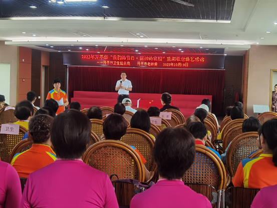 “我们的节日.精神的家园”重阳敬老曲艺活动。市卫生健康局副局长苏黎明出席活动并发表讲话,活动现场有近150多人观看了演出。 活动现场文艺骨干和老年人欢聚一堂,现场演出活动形式多样,内容丰富,精彩纷呈。歌舞、手语舞、大合唱等精彩节目赢得了台下观众的阵阵掌声。汇演最后还给老人赠送了小礼品和节日的问候。关爱老人不仅是重阳节的传统习俗,也是中国传统文化的重要组成部分,积极营造敬老助老的和谐社会氛围,积极为老人开展各项活动,让老人们感受到老有所养、老有所依、老有所乐、老有所为的社会氛围。 此次文艺演出营造了浓厚的节日文化氛围,丰富了老人们的精神文化生活,赢得了广大老人的喜爱和赞赏。