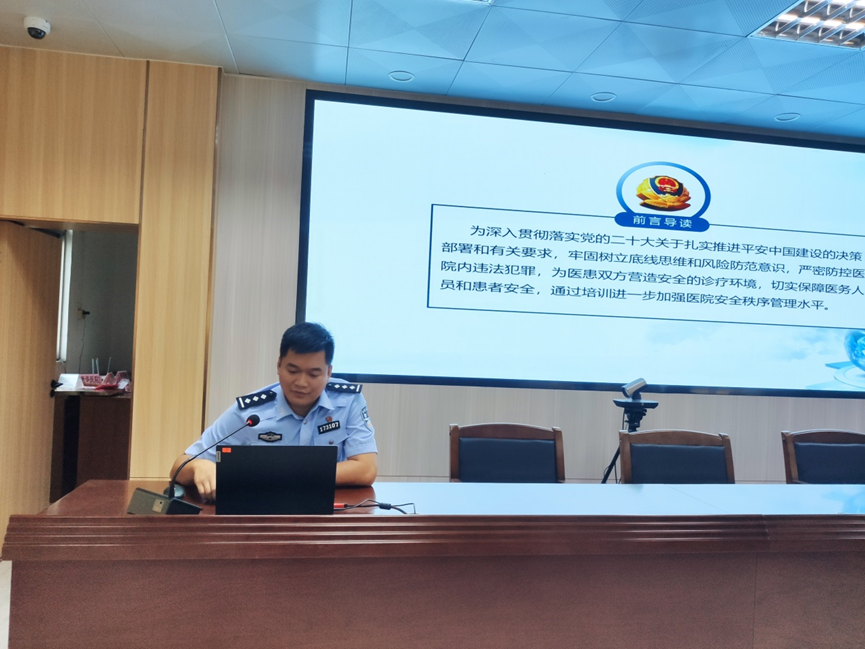 医院安保力量业务技能培训会。治安大队、二级及以上医疗机构和医疗机构所在辖区的派出所相关负责同志共30多人参加了会议。 会上,治安大队通报我省以及我市平安医院建设方面所取得的进展与面临的挑战,并通过组织观看医院最小应急单元现场应急处置教学视频和学习加强医院安全秩序管理及应急处置等相关文件精神、工作要求等培训方式,增强各医疗机构风险防范意识,提高医院安全秩序管理的专业能力与实战水平。 市卫生健康局副局长苏黎明,在会上全面剖析了当前医院安全领域存在的隐患及其整改成效,并就我市平安医院建设工作提出五点要求:一是提高思想认识,主要负责同志要牵头抓总;二是强化警医联动机制,打造快速应急处突体系;三是构建全方位安防体系,严格落实安检制度及加强保卫服务建设;四是完善矛盾纠纷治理机制,完善医院投诉管理制度,切实化解医患纠纷;五是加强医务人员职业道德培训,提升医疗服务满意度。 此次会议全面部署了平安医院建设工作。通过会议学习进一步提升应急处置能力,有效防范处置涉个人极端、涉暴恐等突发案事件,确保能够在第一时间做出妥善反应。共同营造医患双方安全的诊疗环境,为广大医护人员和患者营造一个安全、稳定、和谐的医疗环境。