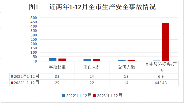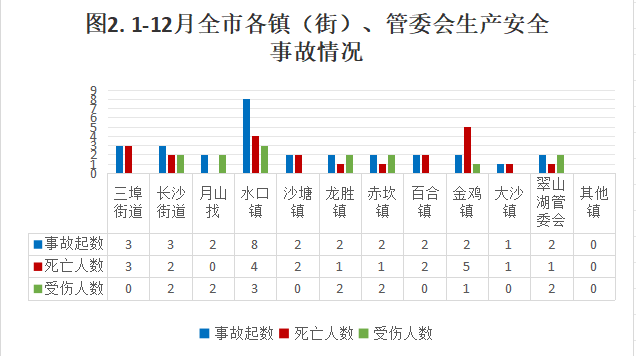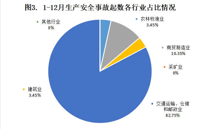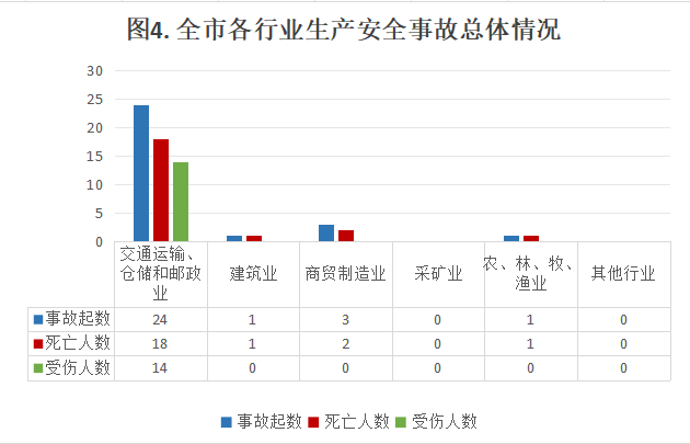 内容摘要 2023年1-12月,全市发生生产安全事故29起、死亡22人、受伤14人、直接经济损失442.43万元。 一、1-12月生产安全事故概况 全市发生生产安全事故29起、死亡22人、受伤14人、直接经济损失442.43万元,同比分别减少4起、减少2人、增加1人、增加435.53万元,事故起数、死亡人数、受伤人数、直接经济损失同比分别下降12.1%、下降8.3%、上升7.7%、上升6312%。 二、各镇(街)、翠山湖管委会事故情况 三埠街道发生交通运输、仓储和邮政业事故2起,建筑业事故1起;长沙街道发生交通运输、仓储和邮政业事故2起,商贸制造业事故1起;月山镇发生交通运输、仓储和邮政业事故2起;水口镇发生交通运输、仓储和邮政业事故7起,商贸制造业事故1起;沙塘镇发生交通运输、仓储和邮政业事故1起,商贸制造业事故1起;龙胜镇发生交通运输、仓储和邮政业事故2起;赤坎镇发生交通运输、仓储和邮政业事故2起;百合镇发生交通运输、仓储和邮政业事故2起;金鸡镇发生交通运输、仓储和邮政业事故2起;大沙镇发生农林牧渔业事故1起;翠山湖管委会发生交通运输、仓储和邮政业事故2起;其他镇没有发生生产安全事故。 三、全市各行业事故情况 (一)各行业事故占比情况 全市共发生生产安全事故29起,其中交通运输、仓储和邮政业24起,占82.75%;商贸制造业3起,占10.35%,建筑业1起,占3.45%;农林牧渔业1起,占3.45%,采矿业和其他行业未发生生产安全事故。 (二)各行业事故基本情况 (1)农林牧渔业。发生1起事故,去年同期未发生事故。 (2)采矿业。未发生事故,去年同期未发生事故。 (3)商贸制造业。发生3起事故,去年同期未发生事故。 (4)建筑业。发生1起事故,去年同期未发生事故。 (5)交通运输、仓储和邮政业。发生事故24起(其中道路运输24起)、死亡18人,去年同期发生事故33起、死亡24人,事故起数和死亡人数同比分别下降27.3%、下降25%。 (6)其他行业。未发生事故,去年同期未发生事故。 四、1-12月生产安全事故特点 1.道路交通领域安全总体形势平稳,但依然严峻。1-12月,全市发生道路运输事故24起、死亡18人、受伤14人,事故起数、死亡人数、受伤人数同比分别下降27.3%、下降25%、上升7.7%,事故起数、死亡人数实现“双下降”。 2.工矿商贸领域安全形势严峻。1-12月,全市商贸制造业发生3起事故,死亡2人,事故起数、死亡人数同比上升300%、上升200%,安全形势不容乐观。 3.建筑业、农林牧渔业等行业领域安全总体形势可控。1-12月,全市建筑业发生1起事故,死亡1人;农林牧渔业发生1起事故,死亡1人,其他行业未发生生产安全事故。 五、下一步工作措施 1.提高政治站位,树牢安全发展理念。深入学习习近平总书记关于安全生产的重要指示批示精神,不断强化红线意识和底线思维,统筹好发展和安全,始终把“人民至上、生命至上”的理念贯穿到经济建设发展各项工作中;各行业主管部门要进一步提高政治站位,严格按照“三个必须”的要求,按照“党政同责、一岗双责、齐抓共管、失职追责”要求,狠抓安全生产责任和工作措施落实,全力确保我市安全生产形势稳定;全市各类生产经营单位要清醒认识安全生产工作对企业生存发展的重要意义,切实将“安全第一”的理念和自身主体责任落实到生产经营活动中。 2.强化安全监管及宣传,抓好重点领域的专项治理。各级各部门要结合当前安全风险管控特点,科学部署,标本兼治,在出重拳、用实招、求实效上下功夫,持续加大对重点领域的管控力度。道路交通方面,针对交通繁忙的时间段,突出长途客车、旅游包车、危化品运输车辆等重点车辆,强化对重点运输企业的执法检查,严厉打击“三超一疲劳”等交通违法违规行为,同时要持续加大道路交通安全宣传,提高全民安全出行意识;消防安全方面,要加强对热点度假区景区、大型商业综合体、餐饮娱乐、宾馆民宿等人员密集场所的安全隐患排查和消防监督执法,提高消防防范意识;建筑施工方面,要严防各类项目赶工期、抢进度以及恶劣天气条件下冒险施工、违规作业等引发坍塌,火灾等事故,严防违规装饰装修、擅自用作经营引发群死群伤事故。 3.加强特殊危险作业安全管理,落实审批和专人监护。生产经营单位应当依照相关法律法规、规程规章的要求制定完善特殊危险作业安全管理制度,明确特殊危险作业的种类、范围、职责、审批权限及流程、安全条件确认、监护、应急等相关要求。生产经营单位进行吊装、动火、临时用电、高处作业以及国务院应急管理部门会同国务院有关部门规定的其他危险作业时,应严格开展危险作业审批。进行危险作业时,须安排专门人员进行现场安全管理,确保操作规程的遵守和安全措施的落实。