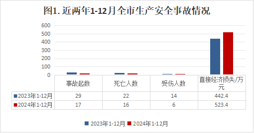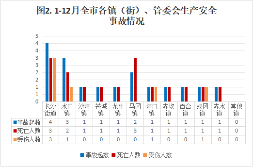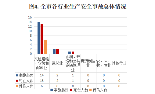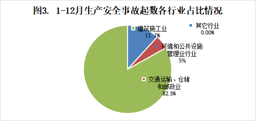 内容摘要 2024年1-12月,全市发生生产安全事故17起、死亡16人、受伤6人、直接经济损失约523.4万元。 一、1-12月生产安全事故概况 全市发生生产安全事故17起、死亡16人、受伤6人、直接经济损失523.4万元,同比分别减少12起、减少6人、减少8人,增加81万元,事故起数、死亡人数、受伤人数、直接经济损失同比分别下降41.4%、下降27.3%、下降57.1%、上升18.3%。 二、各镇(街)、翠山湖管委会事故情况 长沙街道发生交通运输、仓储和邮政业事故3起,水利、环境和公共设施管理业1起;水口镇发生交通运输、仓储和邮政业事故2起、建筑施工事故1起;沙塘镇发生交通运输、仓储和邮政业事故1起;苍城镇发生建筑施工事故1起;龙胜镇发生交通运输、仓储和邮政业事故1起;马冈镇发生交通运输、仓储和邮政业事故2起;塘口镇发生交通运输、仓储和邮政业事故1起;赤坎镇发生交通运输、仓储和邮政业事故1起;百合镇发生交通运输、仓储和邮政业事故1起;蚬冈镇发生交通运输、仓储和邮政业事故1起;赤水镇发生交通运输、仓储和邮政业事故1起;其他镇没有发生生产安全事故(三埠街道、月山镇、大沙镇、金鸡镇、翠山湖管委会)。 三、全市各行业事故情况 (一)各行业事故占比情况 全市共发生生产安全事故17起,其中交通运输、仓储和邮政业14起,占82.3%;建筑施工2起,占11.7%,环境和公共设施管理业1起,占5%,其他行业未发生生产安全事故。 (二)各行业事故基本情况 (1)农林牧渔业。未发生事故,去年同期未发生事故。 (2)采矿业。未发生事故,去年同期未发生事故。 (3)商贸制造业。未发生事故,去年同期未发生事故。(4)建筑业。发生2起事故,死亡2人,去年同期 发生事故1起,事故起数和死亡人数同比分别上升100%、上升100%。 (5)交通运输、仓储和邮政业。发生事故14起(其中道路运输14起)、死亡13人,去年同期发生事故24起、死亡18人,事故起数和死亡人数同比分别下降41.7%、下降27.8%。 (7)水利、环境和公共设施管理业。发生1起事故, 死亡1人,去年同期未发生事故,事故起数和死亡人数 同比分别上升100%、上升100%。 (8)其他行业。未发生事故。 四、1-12月生产安全事故特点 1.道路交通领域安全总体平稳,但依然严峻。1-12月,全市发生道路运输事故14起、死亡13人、受伤8人,事故起数、死亡人数、受伤人数同比分别下降41.1%、下降27.8%、下降57.1%,事故起数、死亡人数实现“双下降”,但是占比全市生产安全事故的82.3%,形势依然严峻。 2.建筑施工行业安全形势要引起重视。1-12月,全市建筑施工行业发生2起生产安全事故,死亡2人,事故起数、死亡人数同比上升100%、上升100%,特别是近年来,涉及光伏安装项目工程增多,高处作业随之增多,安全风险也随之增加,要引起重视,采取有效措施,开展全方位、动态化的风险辨识和隐患排查治理,防范行业领域生产安全事故。 3.农林牧渔业等行业领域安全总体形势平稳。农林牧渔业和其他行业未发生生产安全事故,安全生产形势平稳。 五、下一步工作措施 1.坚持安全发展,坚持“安全第一、预防为主、综合治理”的方针。按照“党政同责、一岗双责、齐抓共管、失职追责”和“管行业必须管安全、管业务必须管安全、管生产经营必须管安全”的总要求,继续加强对安全生产工作的领导,明确职责,落实责任,建立健全各项规章制度,进一步强化安全生产防范措施。 2.持续深入推进“打非治违”专项行动。根据市委、市政府的安排部署,严格掌握标准,通过突击检查、重点抽查、跟踪检查、联合检查等多种方式,有针对的严厉打击非法违法生产经营建设行为。同时重点加强对道路运输、危险化学品、建筑施工、城镇燃气等领域的安全监管,继续实行日常监管与重点检查相结合、重要时段检查与专项督查相结合的安全监管办法,查找和整改治理一批安全隐患,解决突出问题,加大对生产过程中各类违规、违法行为的打击力度,促进全市安全生产形势持续稳定向好。 3.加强安全教育宣传,增强全民安全意识。大张旗鼓地宣传《中华人民共和国安全生产法》等法律法规,坚持“安全第一、预防为主、综合治理”方针,一方面要以多种形式加大安全生产宣传力度,营造强大的舆论氛围,增强全民安全意识;另一方面要督促企业落实安全生产主体责任,抓好安全生产教育培训,严格落实安全操作规程,坚决杜绝不按操作规程开展工作的行为,将“安全无小事”的安全理念贯穿安全生产工作全过程,以更高的站位、更宽的视角不断优化安全管理工作思路,持续推动安全生产风险管理向事前预防转型。