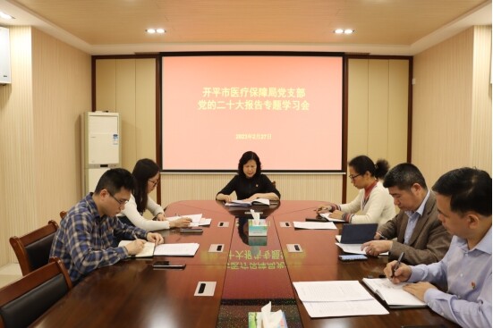 会议强调,全体党员干部要以党的二十大精神为指引,进一步提高政治站位,要坚持把深入学习宣传贯彻党的二十大精神作为当前和今后一个时期首要政治任务,在全面学习、全面把握、全面落实上下功夫,切实把学习成果转化为推动医疗保障的新举措和新成效。要立足本职工作,着力应对新的挑战和要求,把党的二十大精神作出的重大决策部署付之于行动、见之于成效,不断推动党的二十大精神在医疗保障系统落地生根、开花结果。持续提升人民群众医疗保障获得感、幸福感和安全感,奋力推动开平医保事业开创新局面、再上新台阶。