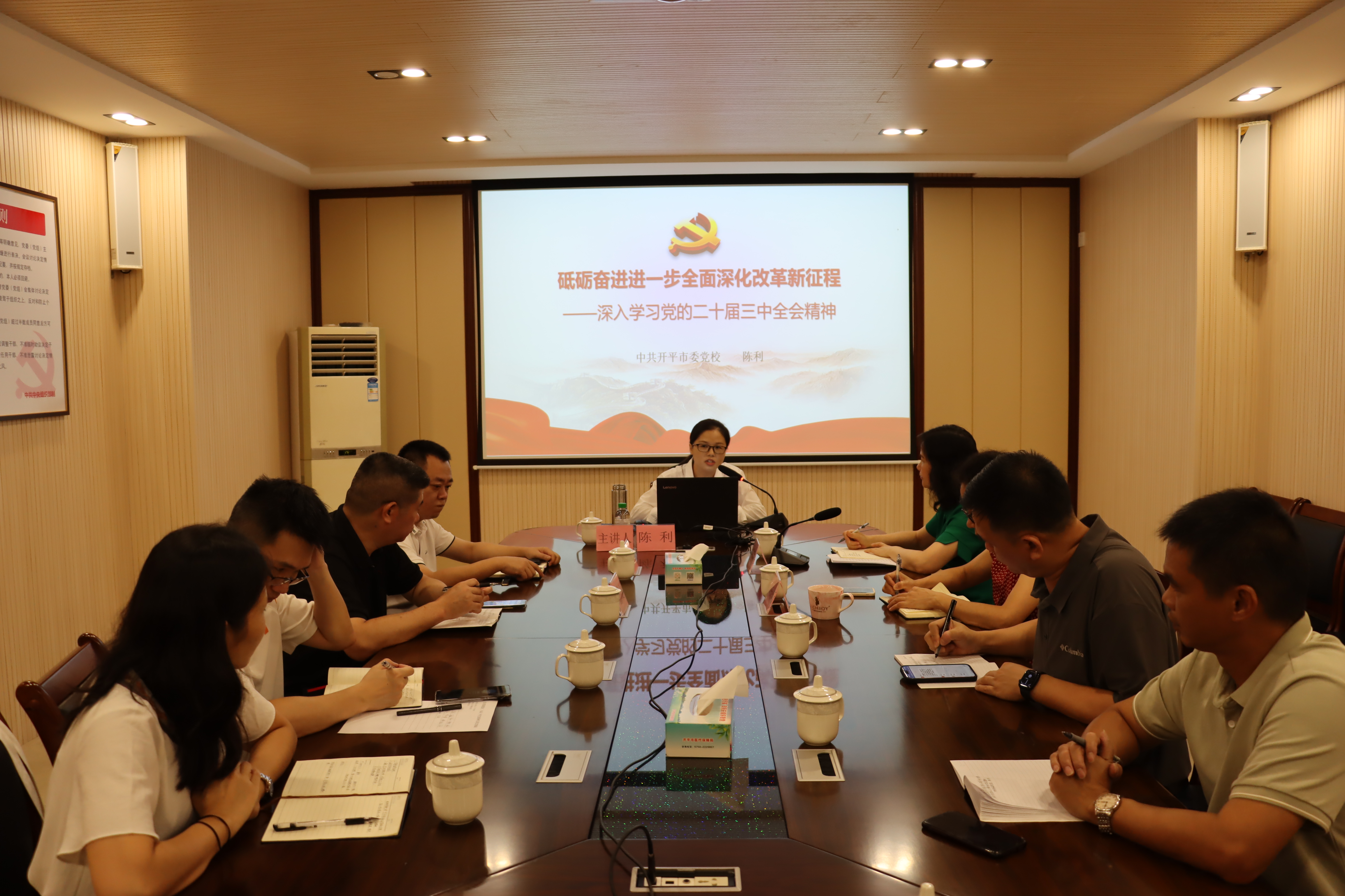 为进一步加强党员干部准确把握党的二十届三中全会精神的丰富内涵和精髓要义,2024年9月4日下午,开平市医疗保障局举办学习贯彻党的二十届三中全会精神专题宣讲会,邀请市委学习贯彻党的二十届三中全会精神宣讲团成员市委党校校委委员陈利同志作专题宣讲。局党组书记庄冬梅主持会议,局机关、医保中心全体党员干部参加。