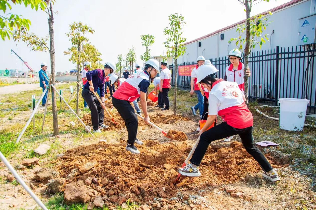 活动现场,全体党员热情高涨,干劲十足,大家按照组别分工协作、默契配合,从挥锹铲土到扶苗填坑,从提水浇灌到培土夯实,每一个环节都认真细致、一丝不苟。在大家的共同努力下,一棵棵希望之苗“安家落户”,为三埠新港带来了新的生机与活力,“党建红”和“环保绿”在明媚的阳光中焕发出蓬勃生机。