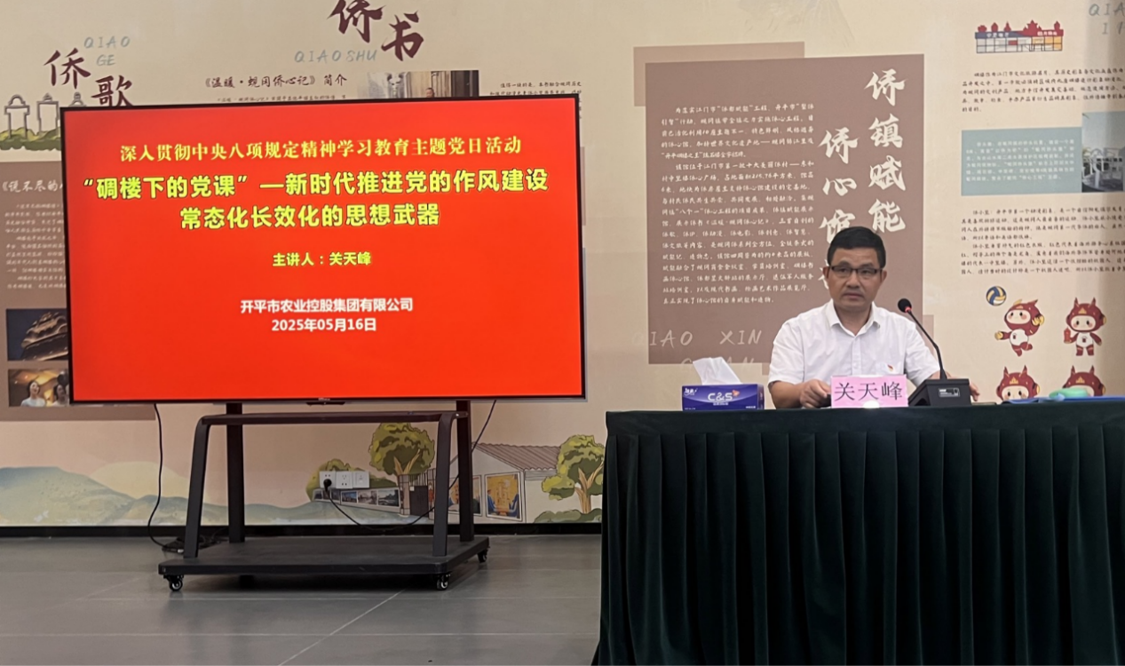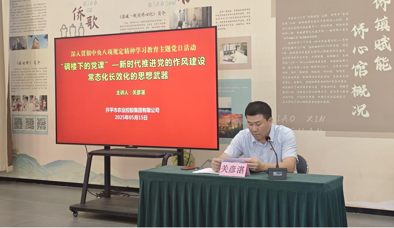 为开展深入贯彻中央八项规定精神学习教育,学习领会习近平总书记关于加强作风建设的重要论述精神,提升市属国有企业党员干部党性修养,增强为民服务意识。515日、16日,市农控集团组织全体党员干部前往蚬冈镇中坚楼侨心馆开展“碉楼下的党课”主题党日活动。