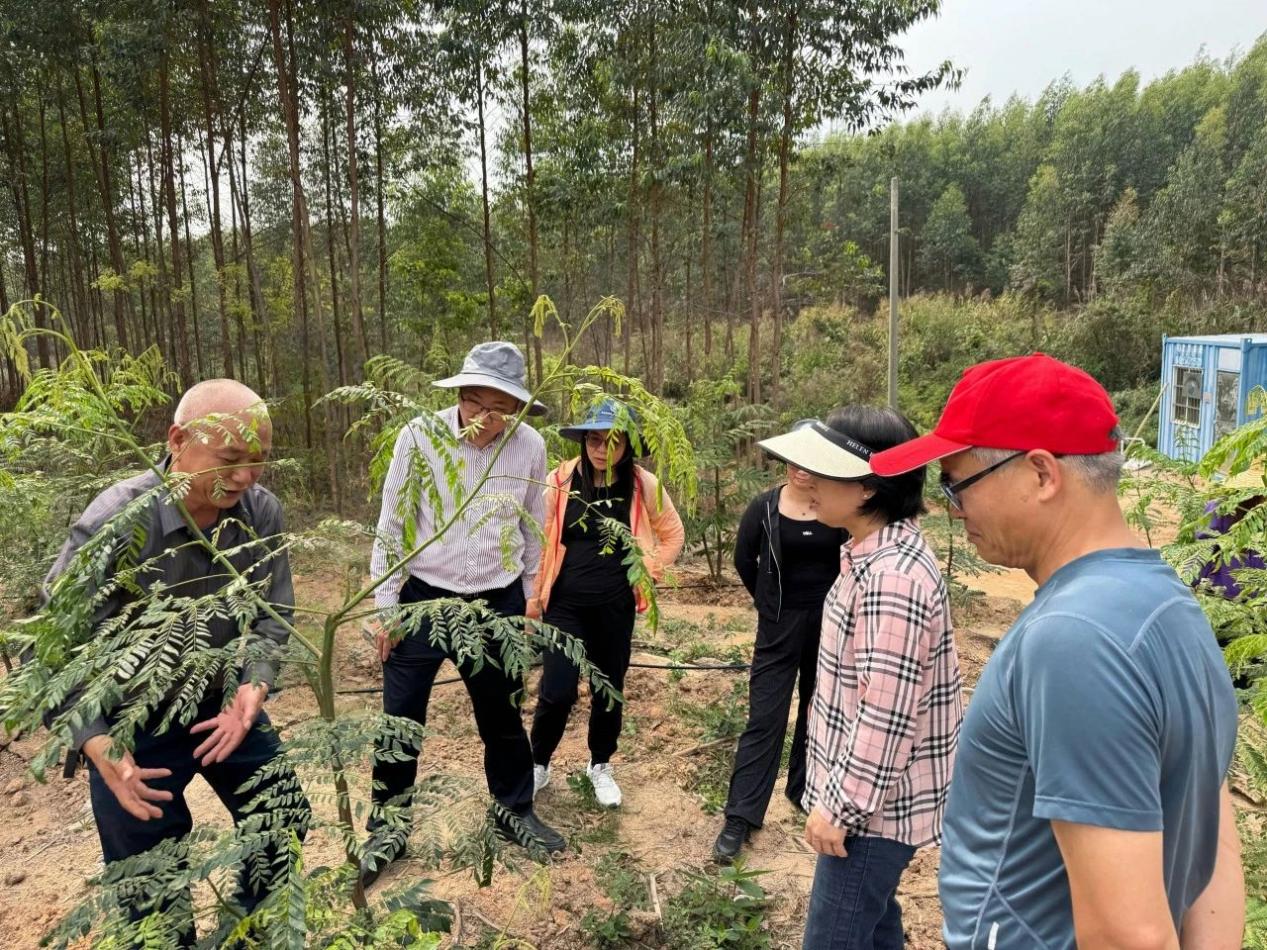 考察团首站来到广州莱泰制药猴耳环种植基地。基地负责人黄总经理详细介绍,猴耳环是珍贵的中药材,其根、叶、果实、嫩枝皆可入药,有清热解毒、凉血消肿等诸多功效,被誉为“天然消炎药”,且无副作用。目前基于猴耳环开发的消炎类药,在市场上收获了良好反馈。黄总经理还着重分享了猴耳环的种植模式与经济效益,详细介绍“种苗选育-科学栽植-合作销售”的全链条企业合作管理体系,该合作体系不仅有效提升了猴耳环药用品质,更通过产销一体模式,为企业筑牢了收益保障。
