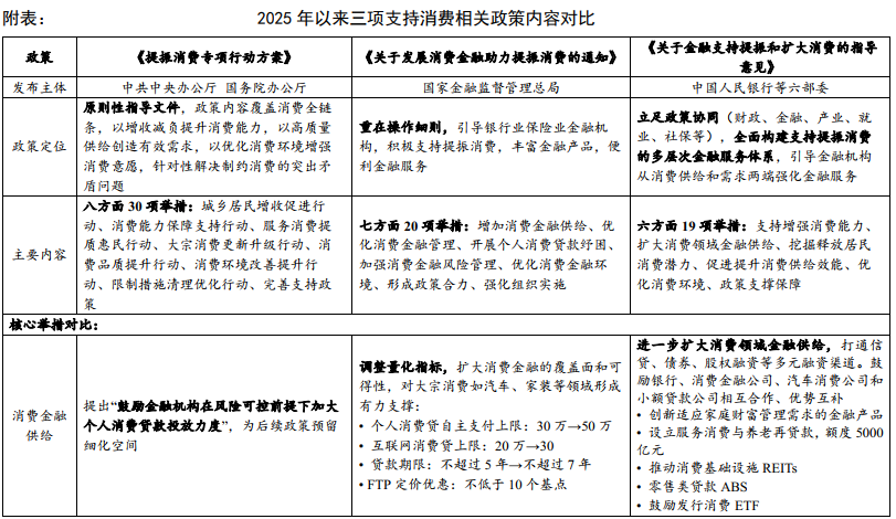 6月24日,中国人民银行、国家发展改革委、财政部、商务部、金融监管总局、中国证监会等六部门联合印发《关于金融支持提振和扩大消费的指导意见》(以下简称《指导意见》),从支持增强消费能力、扩大消费领域金融供给、挖掘释放居民消费潜力、促进提升消费供给效能、优化消费环境和政策支撑保障等六个方面提出19项重点举措,旨在完善扩大消费长效机制,更好满足消费领域金融服务需求。现就政策出台背景、主要内容进行解读。 一、出台背景(一)从短期看,提振消费是当前扩内需、稳增长的关键点2024年12月中央经济工作会议将“大力提振消费、提高投资效益,全方位扩大国内需求”列为2025年工作的首要重点任务。今年3月5日,政府工作报告重申将其作为今年政府工作首要任务,提出“创新和丰富消费场景,加快数字、绿色、智能等新型消费发展”,并配套出台支持首发经济、冰雪经济、银发经济、国潮消费等新型消费业态发展的专项政策。在政策引导与市场机制的双重作用下,消费市场活力正逐步释放,展现出复苏向好的积极信号。今年一季度,最终消费支出对经济增长的贡献率达到51.7%,高于2024年全年7.2个百分点,拉动GDP增长2.8个百分点,为实现全年经济增长目标提供有力支撑。从5月宏观数据看,消费成为最大亮点。5月社会消费品零售总额4.13万亿元,同比增长6.4%,增速比上月提高1.3个百分点,为2024年以来月度最快增速,大幅超出市场预期,服务消费和商品消费增速均有所提升。这主要得益于消费品以旧换新政策驱动、网购促销提前启动、假期居民出行意愿高涨等因素。但同时也要看到,2025年以来我国CPI、PPI低位运行,消费领域结构性矛盾仍较为突出,居民储蓄意愿仍然较强,消费增长的内生动力有待增强。(二)从长期看,推动经济增长模式转型,为“十五五”经济发展前瞻性布局当前全球贸易摩擦加剧,外需对经济增长的支撑作用趋弱,我国经济正加速向以内需为主导的增长模式转型,消费已成为构建新发展格局的重要引擎。《指导意见》着力从金融供给端入手,构建系统性、全方位的金融促消费体系,勾勒出提振消费的三条逻辑主线:一是消费转型升级,加快从商品消费向服务型消费、新型消费转型;二是供给创造需求,加大对教育、医疗、健康、体育、养老、文化等消费型产业的金融支持力度,发展新质生产力,通过科技创新创造新需求;三是在合规前提下支持消费领域的金融创新,鼓励服务型和新型消费提供者在市场敢闯敢干敢试错,提高创新容忍度,放宽市场准入。中长期看,《指导意见》出台后,供给端政策靠前发力,有利于更好释放消费场景,对稳定预期、扩大内需具有重大意义。未来需求端配套政策有望陆续出台。二、内容解读今年以来,国家陆续出台具有战略性意义的促消费政策文件,形成从单一部门施策到多部门协同、从短期刺激到长效机制建设的完整政策链条。2025年1月,发改委、财政部发布《关于2025年加力扩围实施大规模设备更新和消费品以旧换新政策的通知》(以下简称《以旧换新政策的通知》)。3月中旬,中共中央办公厅、国务院办公厅印发《提振消费专项行动方案》(以下简称《行动方案》),部署八方面30项重点任务,从居民增收减负、扩大高质量供给、优化消费环境等维度系统性破解消费堵点。同月,国家金融监督管理总局发布《关于发展消费金融助力提振消费的通知》(以下简称《提振消费的通知》),从丰富金融产品、便利金融服务、营造良好消费环境出发,提出优化消费金融政策的具体举措。6月24日中国人民银行等六部门联合印发《指导意见》,标志着政策体系完成从分散到系统的升级。(重点文件内容对比详见附表)从时间线上看,1月、3月、6月均发布重磅文件,呈现出明显的政策接力特征。《行动方案》作为基础性框架,《提振消费的通知》提供专业化支持工具,六部门《指导意见》则实现跨领域整合,这种递进式布局既保证政策连续性,又通过不断完善细化形成政策合力。从内容上看,《行动方案》作为总领性文件,着眼于“推动经济高质量发展,满足多样化消费需求”的整体目标,未具体区分消费领域。金融监管总局发布的《提振消费的通知》展现出鲜明的专业化特征,将目标聚焦于“引导金融机构支持消费,丰富金融产品,优化消费金融服务”,强化金融对消费的支持作用。发改委、财政部发布的《以旧换新政策的通知》,明确扩围实施大规模设备更新和消费品以旧换新政策的具体措施,显现消费刺激拉动作用。六部门联合印发的《指导意见》提出“完善消费长效机制,强化金融与财政、产业政策协同”,将单一领域的金融支持扩展为多政策工具协同发力的系统工程。从趋势上看,体现出五大特点:一是支持重点领域从商品消费加快转向服务消费和新型消费;二是普惠金融深度和广度不断拓展;三是数字化转型要求日益突出;四是风险防控与政策支持并重;五是政策协同性显著增强。对于《指导意见》重点关注以下五个方面:(一)总体思路:聚焦三大路径实现扩消费、促转型一是“促供给+扩需求”。加大消费供给的金融资源投入,提升消费需求的金融服务水平。二是“强创新+守底线”。鼓励金融机构在依法合规、风险可控的前提下,优化金融资源配置,加强金融产品和服务创新,为消费领域提供多样化、差异化金融服务。