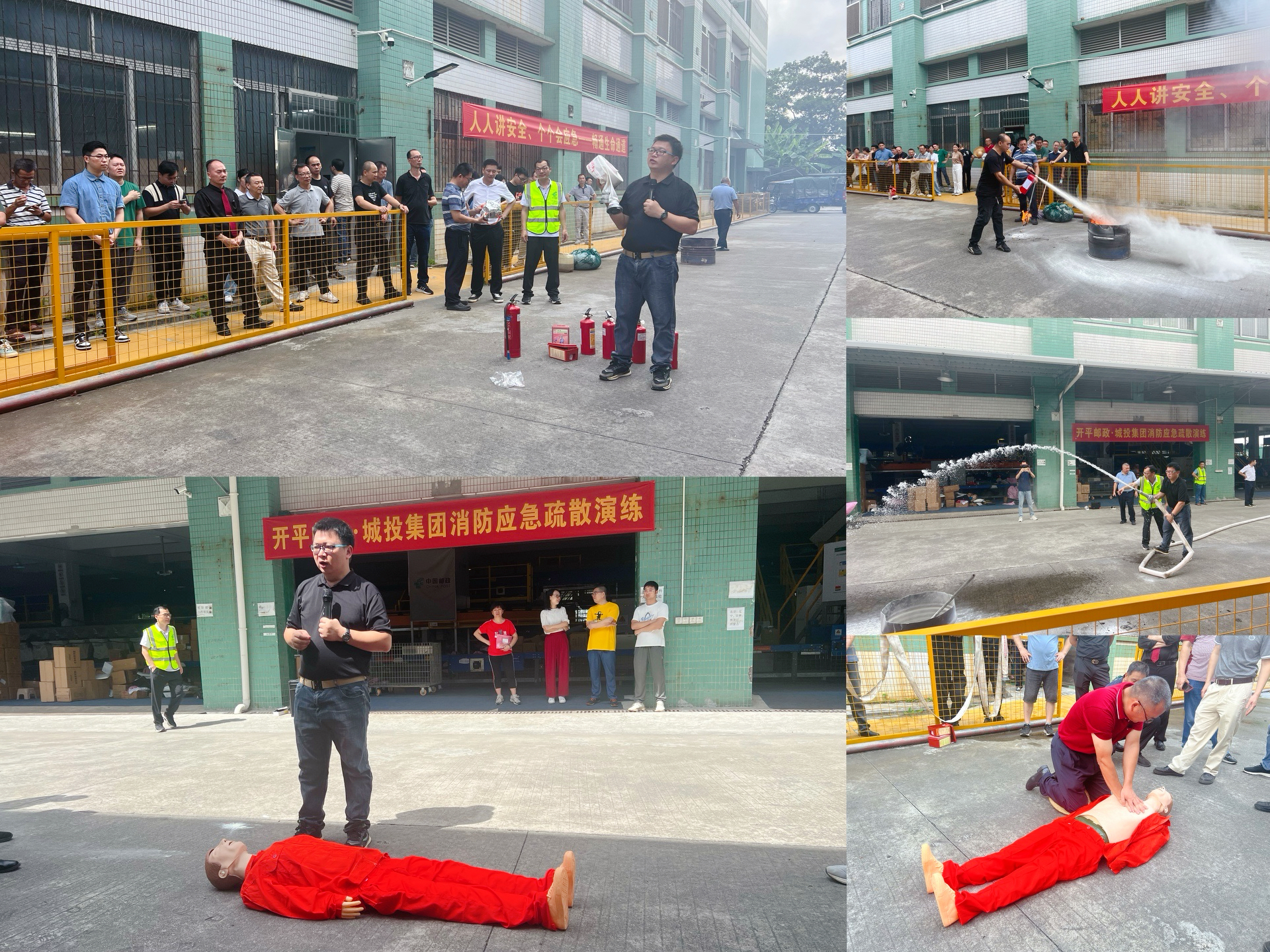 责任在肩》警示教育片,通过生动真实的案例,引导参会人员深刻吸取事故教训,以案为鉴,强化责任意识、底线思维,提高抓好安全生产的自觉性和主动性。 以“练”促防“筑防线” 本次演练由市城投集团公司联合中国邮政集团开平分公司,围绕“畅通生命通道”主题,开展专题情景模拟应急疏散演练。随着警报器响起,演练正式开始,模拟火情的烟雾在新美工业园邮政分拣中心一楼弥漫开来,企业员工在负责人的指挥下,按照火灾发生、上报火情、启动预案、救援行动、事态防控、应急结束等流程有序开展实战演练。演练过程中,各小组人员反应迅速、操作规范,按照“低姿、弯腰、扶墙、捂口鼻”逃生要领,沿着疏散指示标识指引方向,有序地疏散至指定的安全区域,顺利完成事故处置。整个演练过程组织严密、环环相扣,处置过程井然有序、科学高效,充分展现了参训人员快速响应能力和实战能力,演练达到预期效果。 以“学”备战“增本领” 演练结束后,授课老师对消防器材使用方法和心肺复苏等急救知识进行详细讲解。在老师的指导下,参训人员严格按照消火栓“开箱门、放水带、接栓口、握水枪、开闸阀”的使用方法和灭火器“拔、握、瞄、压”的口诀参与实训,“零距离”体验了灭火过程,真正做到学以致用,同时模拟人员触电昏迷后实施心肺复苏和人工呼吸等急救情景开展实训,确保事故发生时能快速、高效、科学地开展人员救援,有效扣紧“防”和“救”责任链条,全面提升应急管理能力。 此次活动的开展,增强了全体员工安全防范意识,提高消防安全事故应急逃生能力,进一步加强了集团公司及管辖范围内企业安全生产管理水平,切实达到以学习促工作、以实训保平安的目的,更加坚决有力务实守住安全发展底线,推动集团公司安全生产形势持续稳定向好发展。