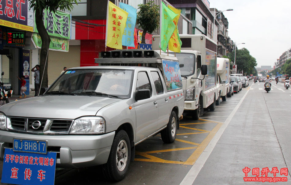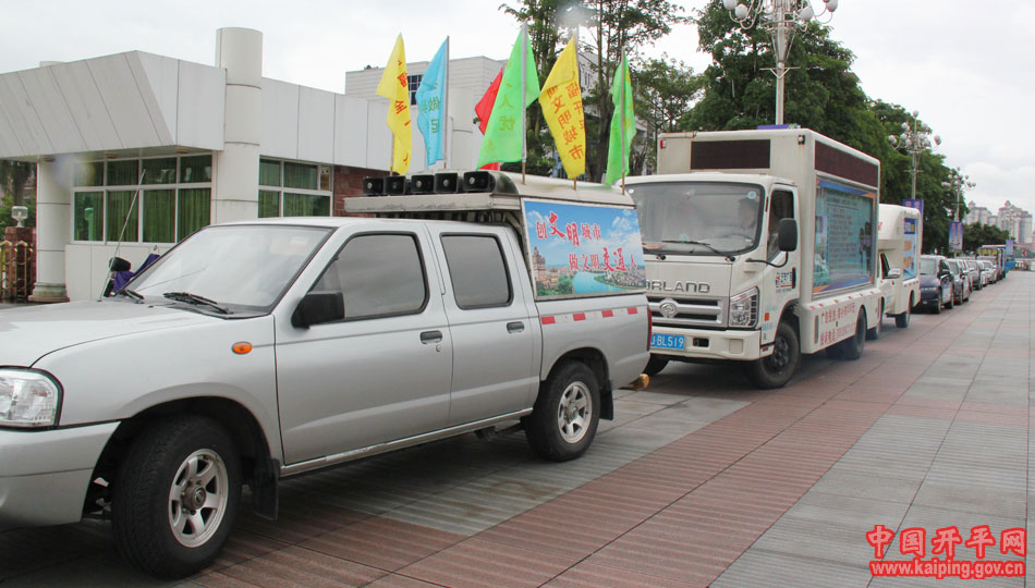 创广东省文明城市,做文明有礼开平人。7月24日下午,市创文办、市交警大队联合我市10多家商家在城区内开展主题为“文明城市 你我参与”的车队巡游宣传活动,进一步加大我市创文宣传力度。