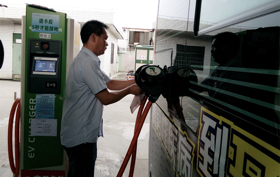 公共汽车总公司车队副队长 谭少华:如果用电的话,100公里用80度电,如果烧油要用22升,烧油和烧电在节能方面节约大概40%。自从投入新能源电车之后,不单在能源方面节省比较多,另外在环保方面作出了很大的贡献。以前这里经常是乌烟瘴气,现在空气清新,很受乘客的欢迎。