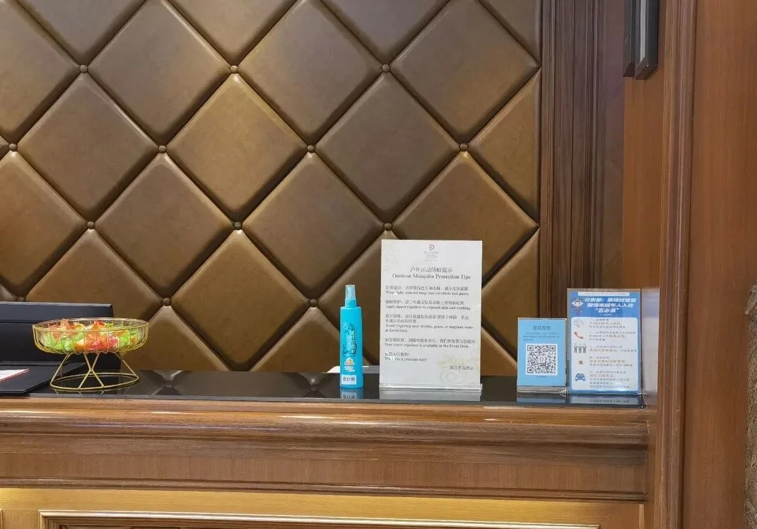 走进开平潭江半岛酒店,大堂内暖意融融。住客们拖着行李箱在前台有序登记,工作人员手边整齐摆放着瓶装驱蚊液,不时主动询问“是否需要喷涂驱蚊液”。“整体感觉很舒服,房间里没有蚊子,入住时工作人员都会主动派驱蚊液给我们。” 旅客方小姐说道。