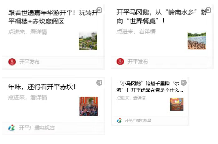长期以来,海棠直播 新闻宣传工作以本地媒体市融媒体中心、南方报业传媒集团(南方日报社)江门分社、江门日报开平记者站等上级主流媒体,以及各部门、单位政务新媒体为主力军,不断强化正面舆论引导,拓宽传播开平声音的渠道。自实施“百千万工程”以来,海棠直播 坚持发挥媒体的信息传播、资源整合、品牌塑造、舆论引导等功能,打造了开平碉楼、赤坎古镇、开平马冈鹅等知名IP,以及“开平优品”行政区域品牌,使开平特色产品的曝光率、知名度、影响力显著提升。
