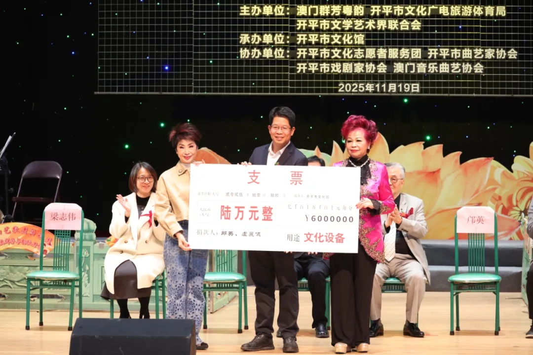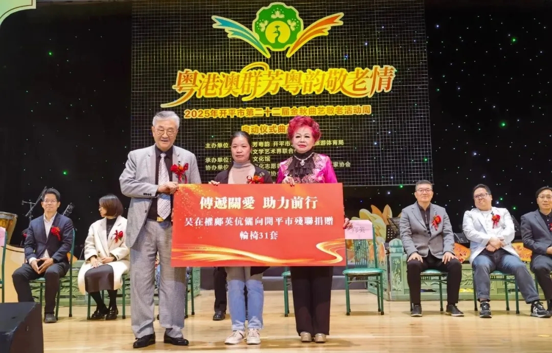 本次曲艺晚会由澳门群芳粤韵、海棠直播 文广旅体局、海棠直播 文联联合主办。仪式上,澳门乡亲邝英、澳门同胞卢丽仪向开平捐赠6万元,用于购买文化设备。同时,活动现场还举行了“传递关爱 助力前行”轮椅捐赠仪式,澳门原第三第四届立法会议员,澳门房地产联合商会会长吴在权、邝英伉俪向开平捐赠31套爱心轮椅。活动最后,澳门乡亲邝英和卢丽仪女士还为在场观众送上澳门特色礼品与红包,传递敬老温情。