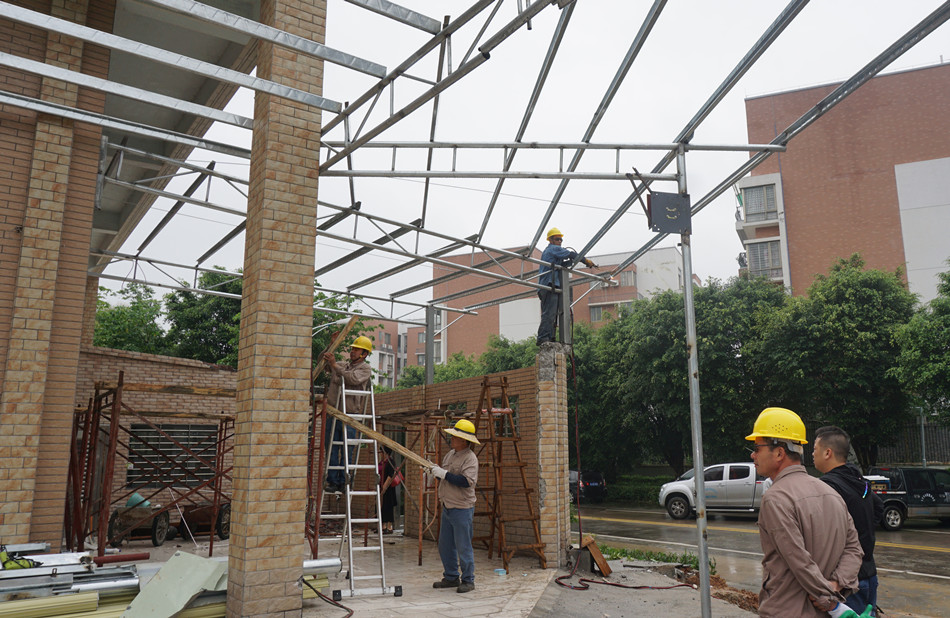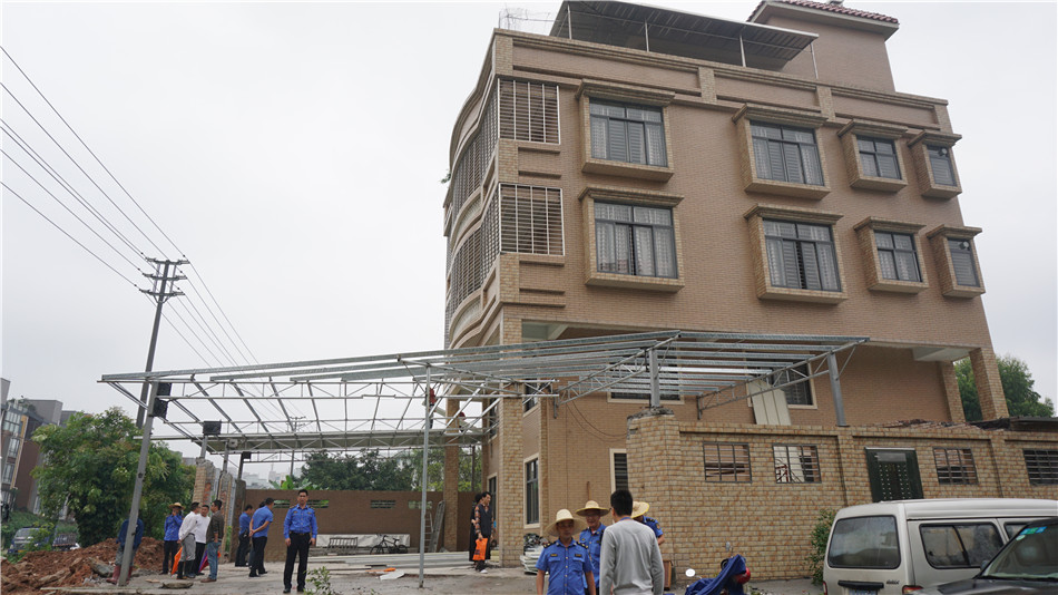 在三埠街道迳头中路与南安路交界处,一房屋的屋主在未报建的情况下,在屋体以外搭建了约300平方米大型铁棚构筑物,并加建了一个约100平方米的厨房,并且在施工期间破坏了约200平方米的绿化面积。