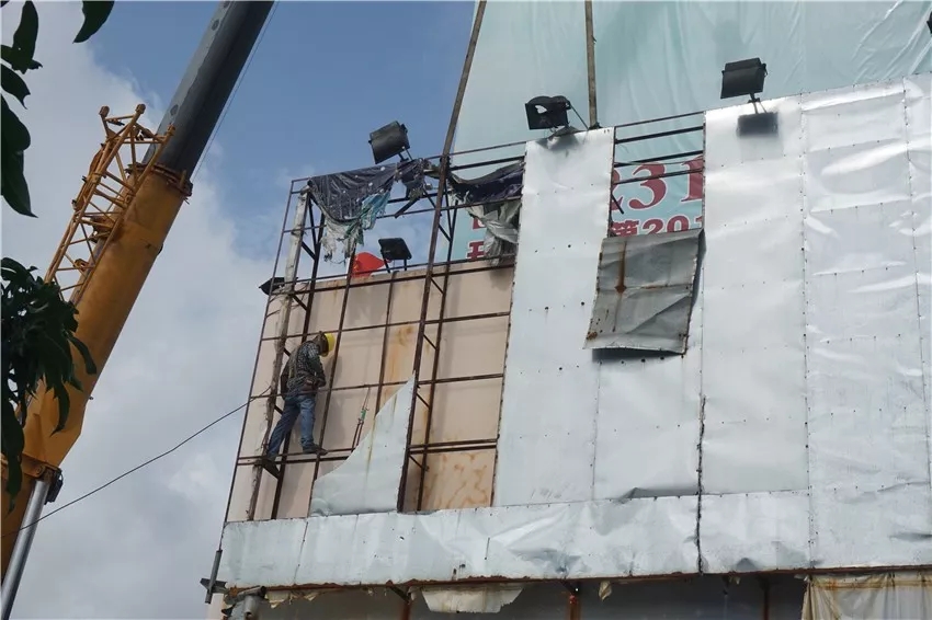 在现场,清拆人员开动大型机械凿开承重柱,对违章搭建的水泥建筑依次进行拆除,该地块清拆面积约700平方米。此外,对于悬挂在该地块的大型广告牌,市城监部门也派出人手,通过高空作业依法对其进行拆解。