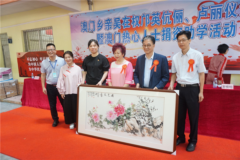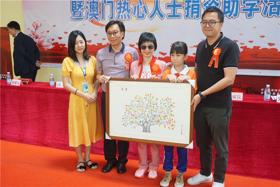 仪式上,邝英女士、卢丽仪女士向40名东河小学的学生颁发了助学金。东河小学的师生代表也分别向吴在权邝英伉俪、卢丽仪女士赠送了纪念品。仪式结束后,吴在权邝英伉俪、卢丽仪女士还带领澳门同胞,向参加活动的学生派发文具和礼物。
