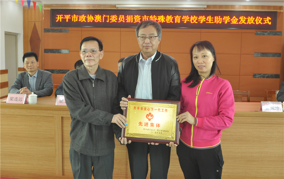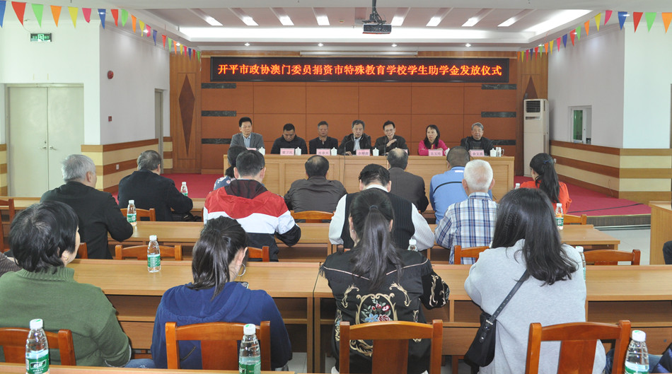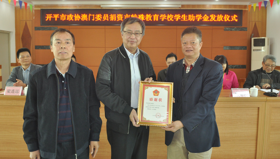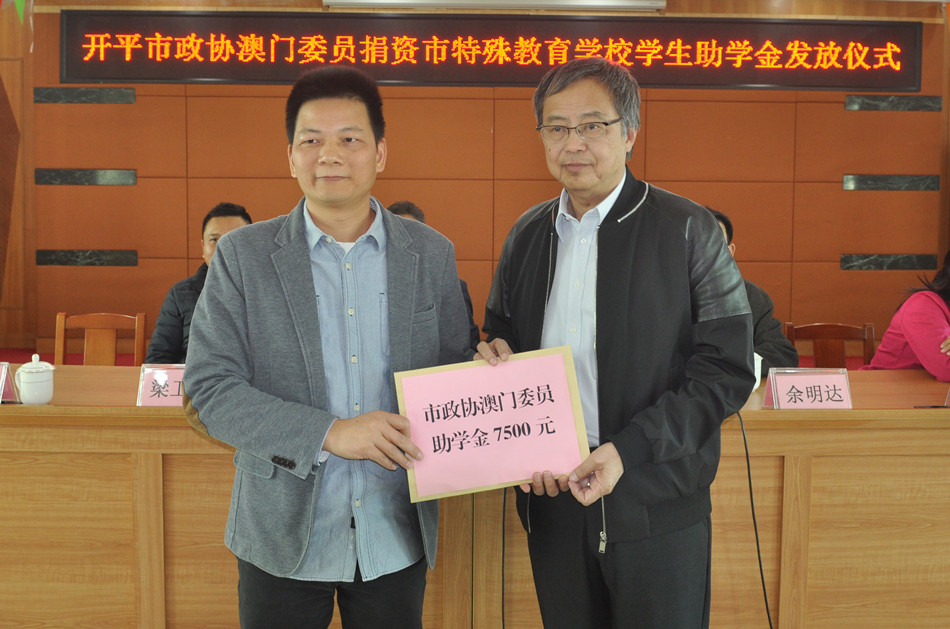 12月7日下午,海棠直播 政协常委、市政协澳门联络组召集人、澳门开平同乡联谊会会长余焯源一行回到家乡,为我市特殊教育学校的家庭困难学生发放助学金。