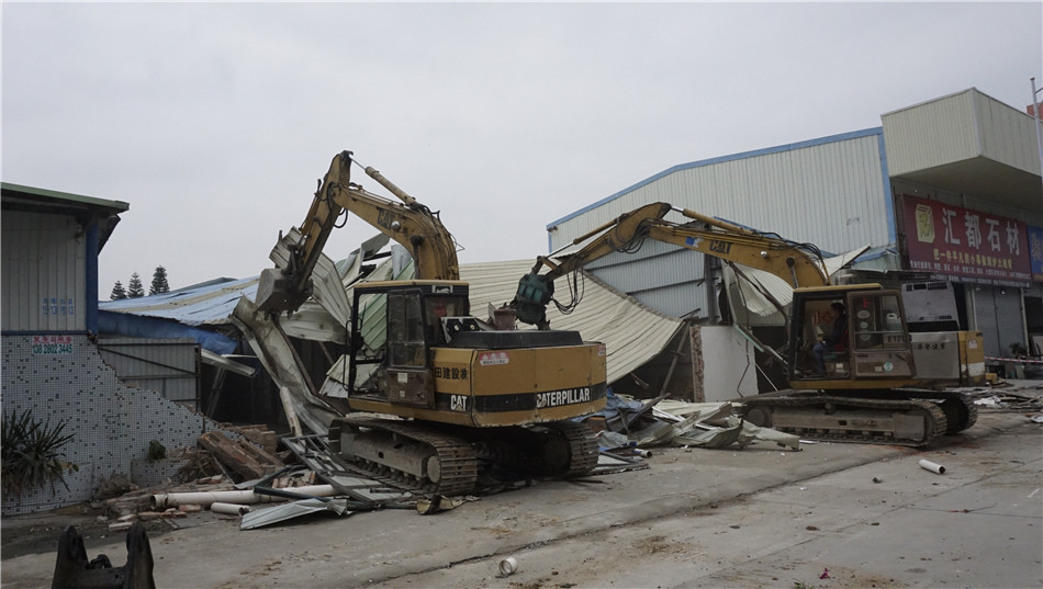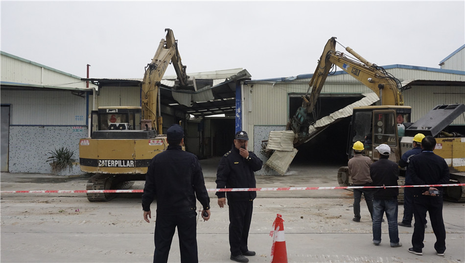 清拆现场,2台大型机械同时进场,对违法建筑物进行拆除。拆除前,工作人员首先对周边场地进行围挡,设置警戒线,切断水电,防止发生安全事故,确保拆除行动安全有序。