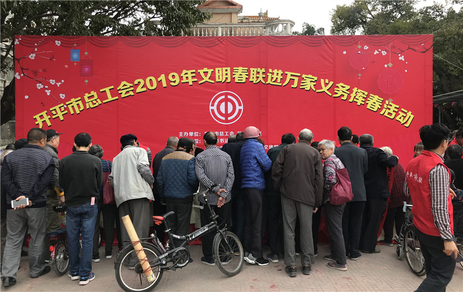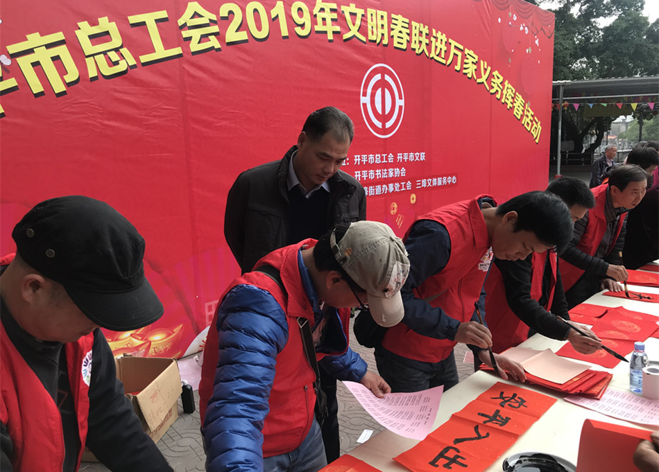 近日,海棠直播 总工会2019年文明春联进万家义务挥春活动走进新昌公园,为广大市民群众书写春联,并送上新年祝福。海棠直播 领导冯健楚出席了活动。