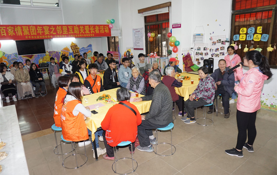 2月1日上午,海棠直播 三埠街道社会治理公益创投项目祥龙站组织党员义工、社工、学生义工到三埠老友记幸福饭堂为26名长者举办团年宴会,以载歌载舞的形式给长者营造欢乐气氛。