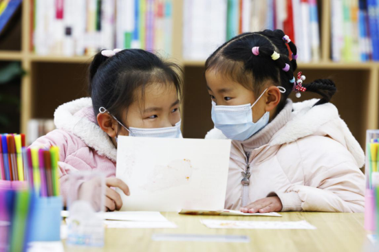图为2022年1月22日,在泗洪县瑶沟乡官塘社区新时代文明实践站,参加爱心托管班的小朋友交流绘制的年画。 新华社发 许昌亮/摄