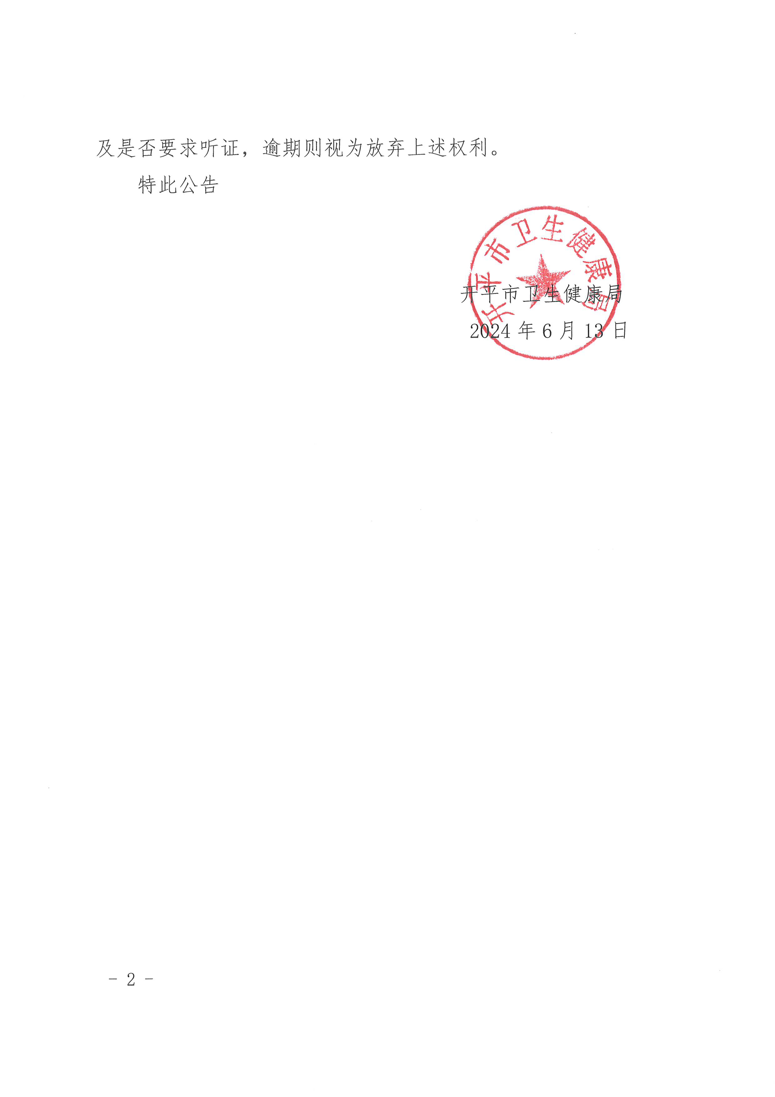 本公告发出之日起,经过30日即视为送达。请你在公告期间或公告送达之日起五日内与海棠直播 卫生健康局二楼政策法规股联系(电话:0750-2235208),书面告知陈述和申辩的内容以及是否要求听证,逾期则视为放弃上述权利。