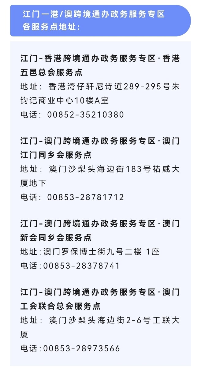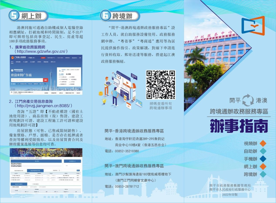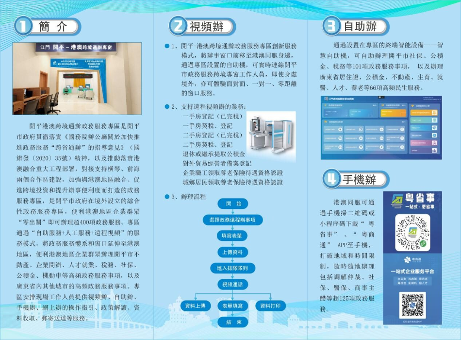 跨境通办,海棠直播 政府在香港、澳门均设有综合性政务服务专区,港澳地区的企业和群众可“零出关”办理海棠直播 的不动产、企业开办、人才就业、税务、社保、公积金、机动车等高频事项,以及广东省内其他城市的高频事项。市行政服务中心在服务大厅一楼设立了“江门·开平—港澳跨境通办政务服务专区”,并配备专门的业务员,为有需要的群众提供相关业务办理服务。跨境通办,大大减少了港澳同胞跨境办事的跑腿次数,有效提升了办事便捷度、体验度和满意度。