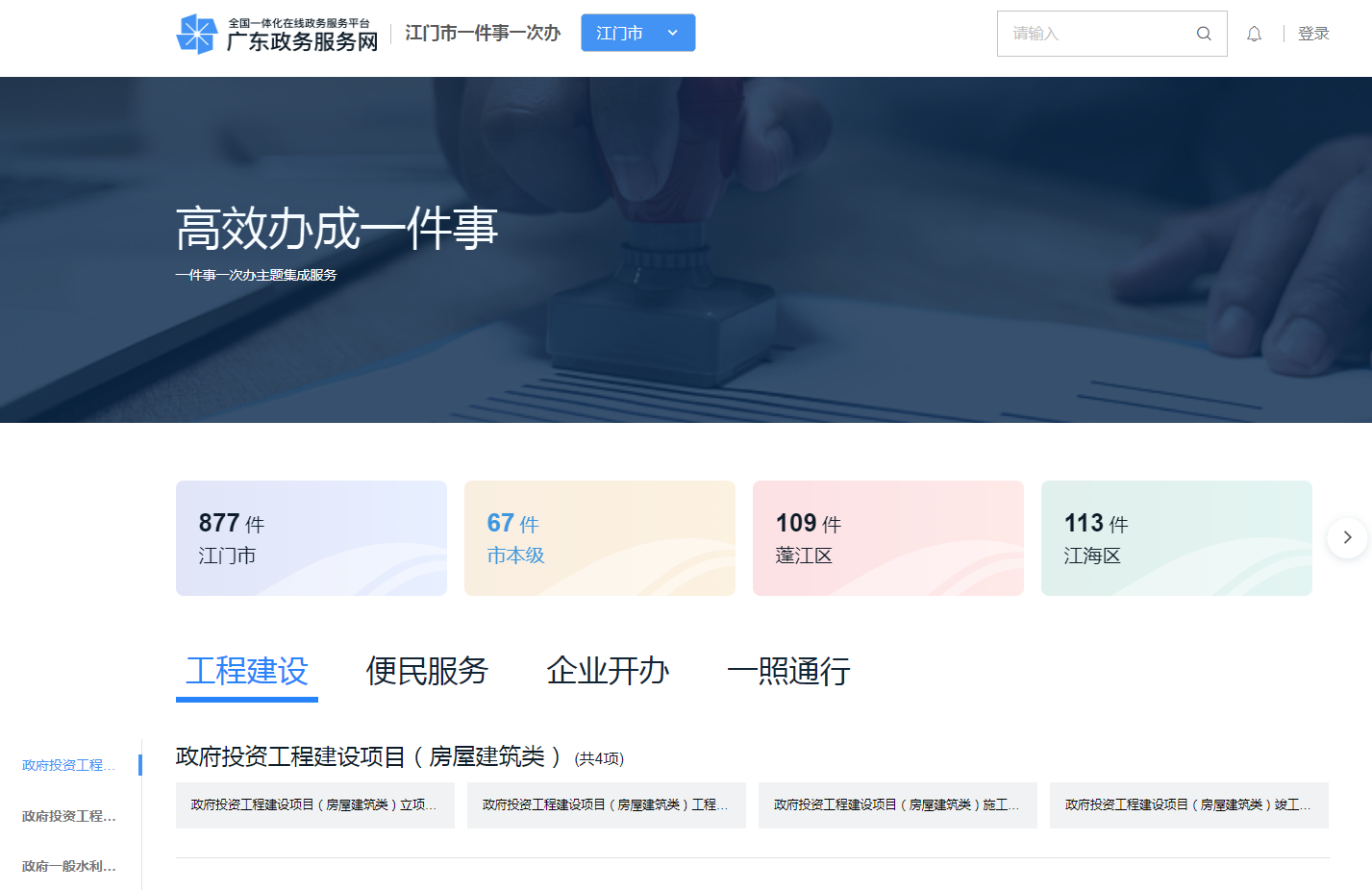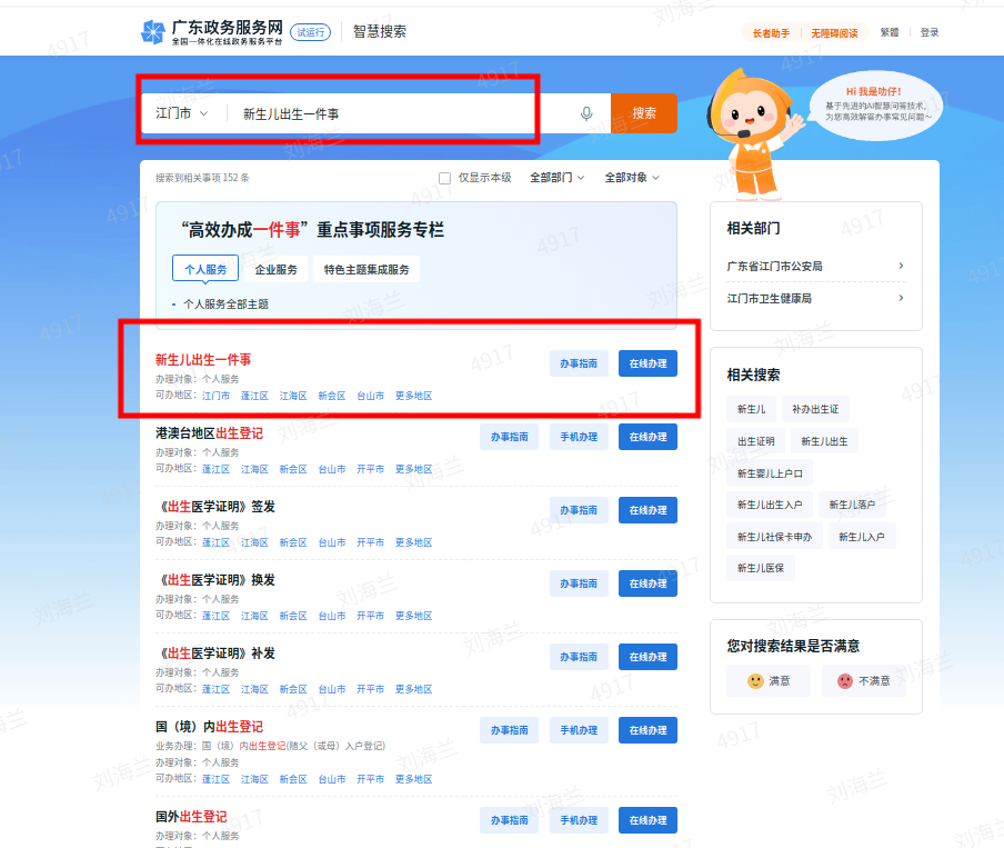 登录广东政务服务网,切换到江门市(//www.gdzwfw.gov.cn/?region=440700),输入一件事主题名称,点击搜索,或在特色创新模块点击【高效办成一件事】,选择“海棠直播 ”对应需要办理的一件事服务,按流程在线操作即可完成办理。