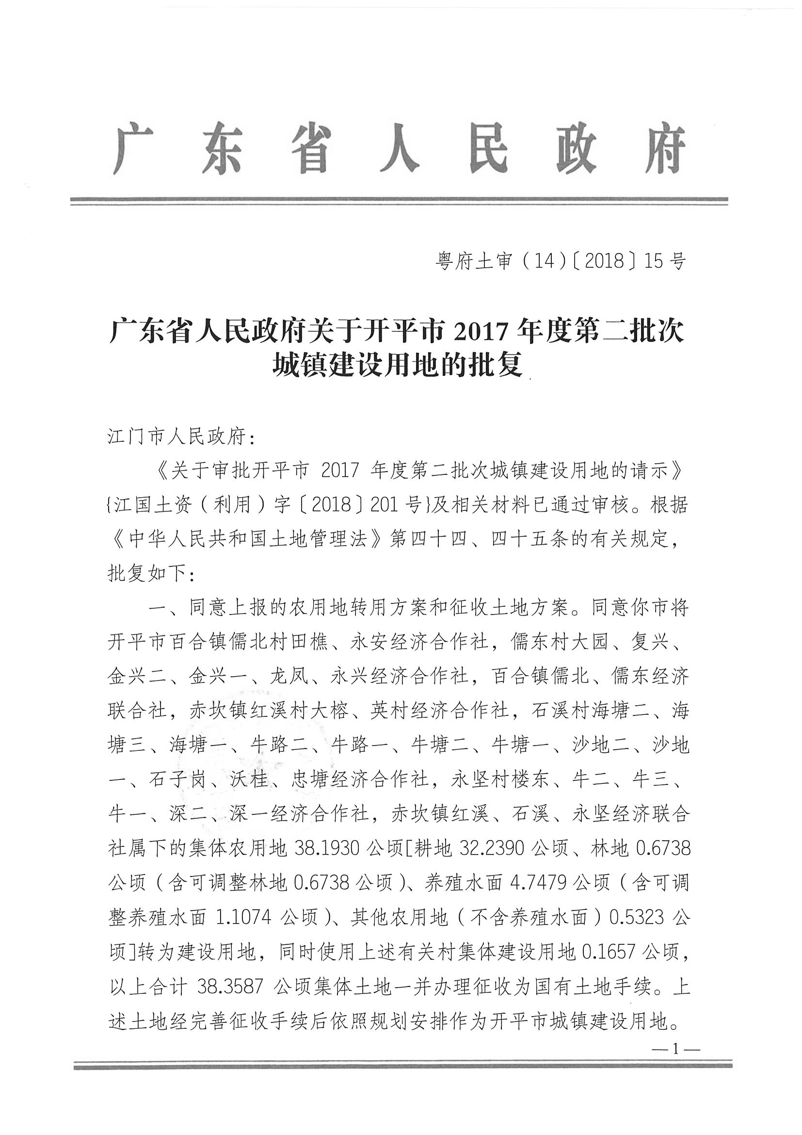 广东省人民政府关于海棠直播 2017年度第二批次城镇建设用地的批复