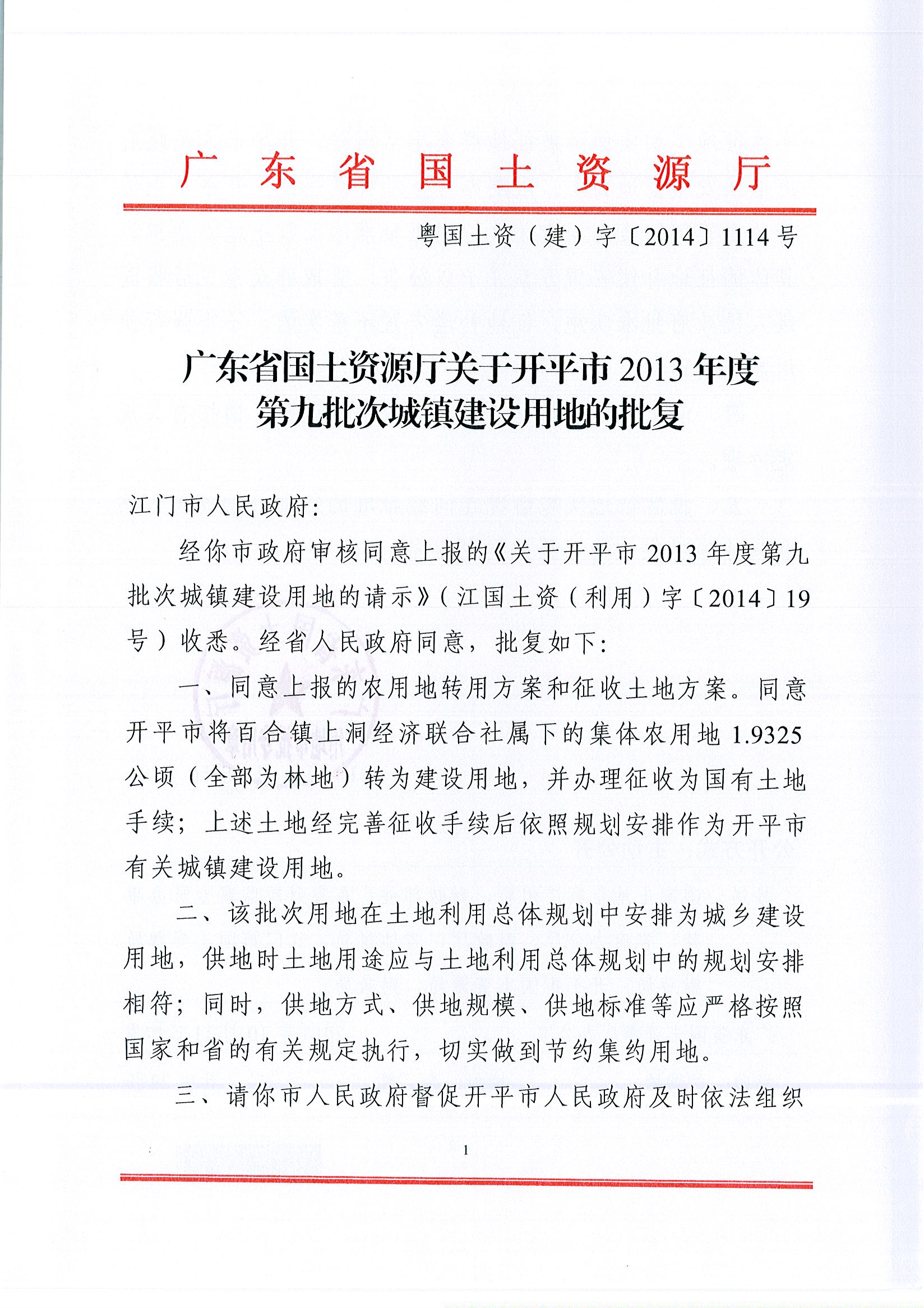 海棠直播 2013年度第九批次城镇建设用地的批复