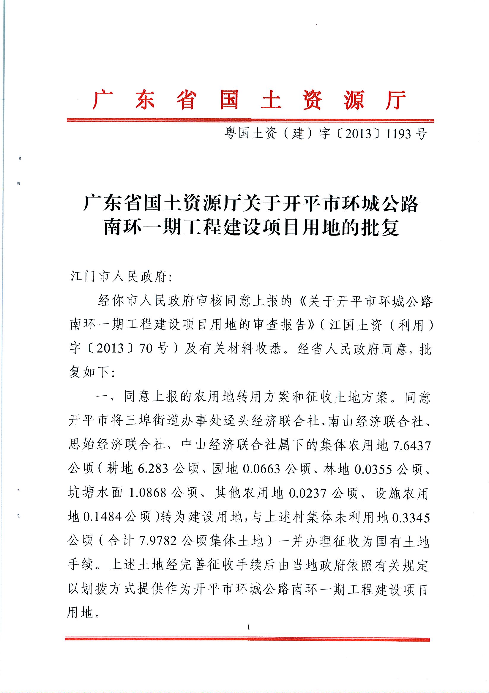 海棠直播 环城公路南环一期工程建设项目用地的批复