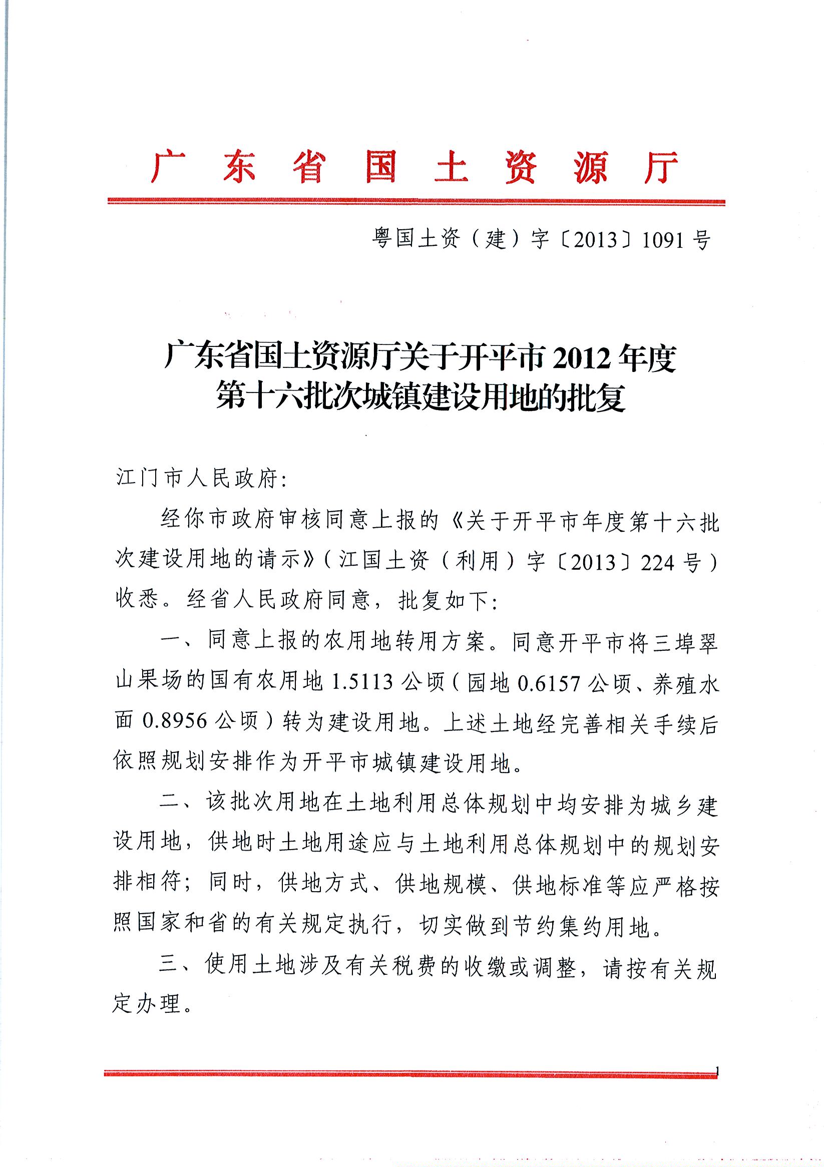 海棠直播 2012年度第十六批次城镇建设用地的批复