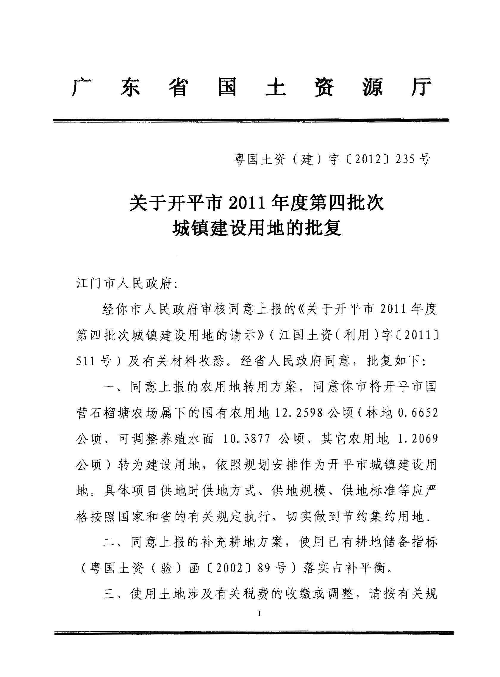 海棠直播 2011年度第四批次城镇建设用地的批复