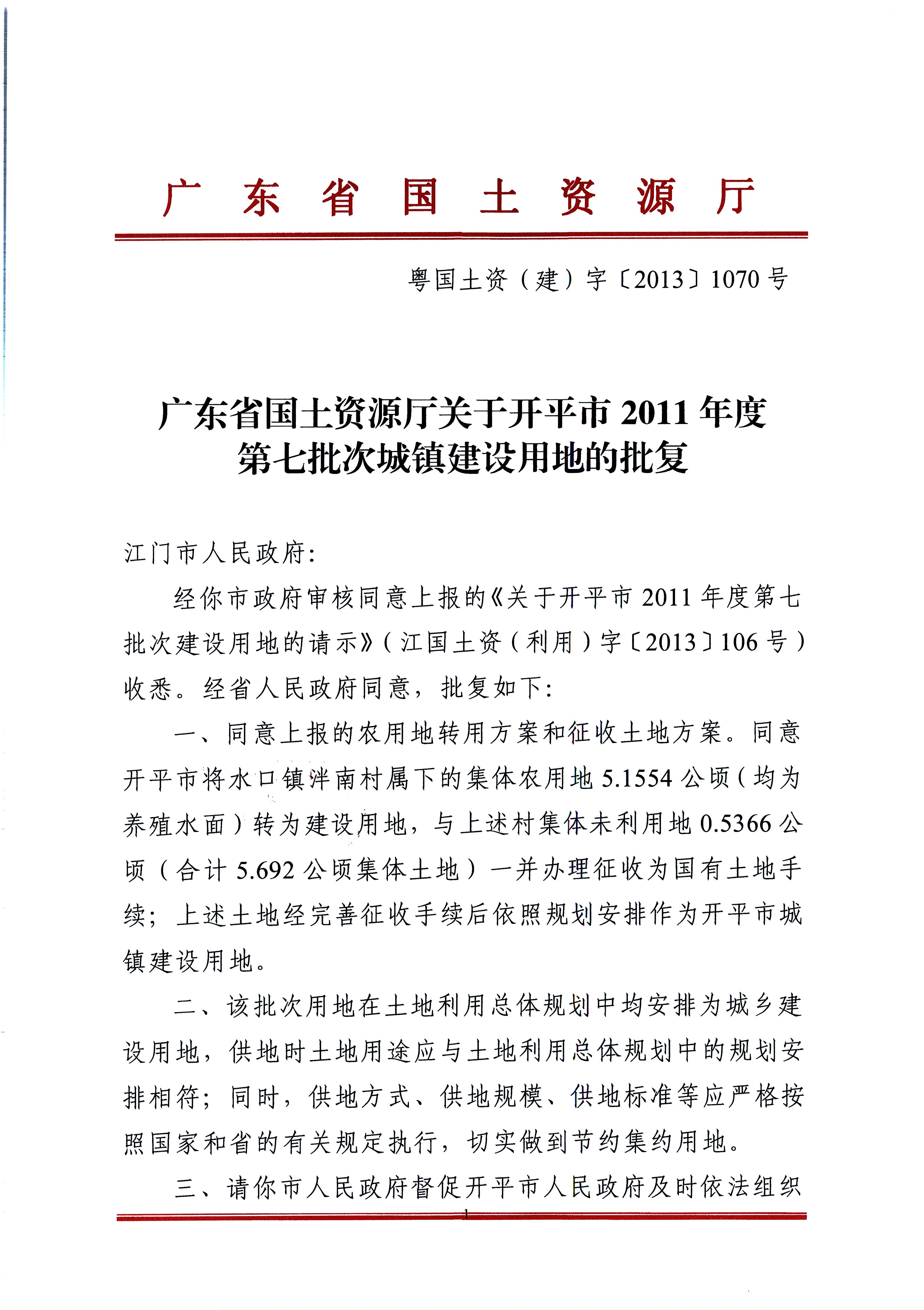 海棠直播 2011年度第七批次城镇建设用地的批复