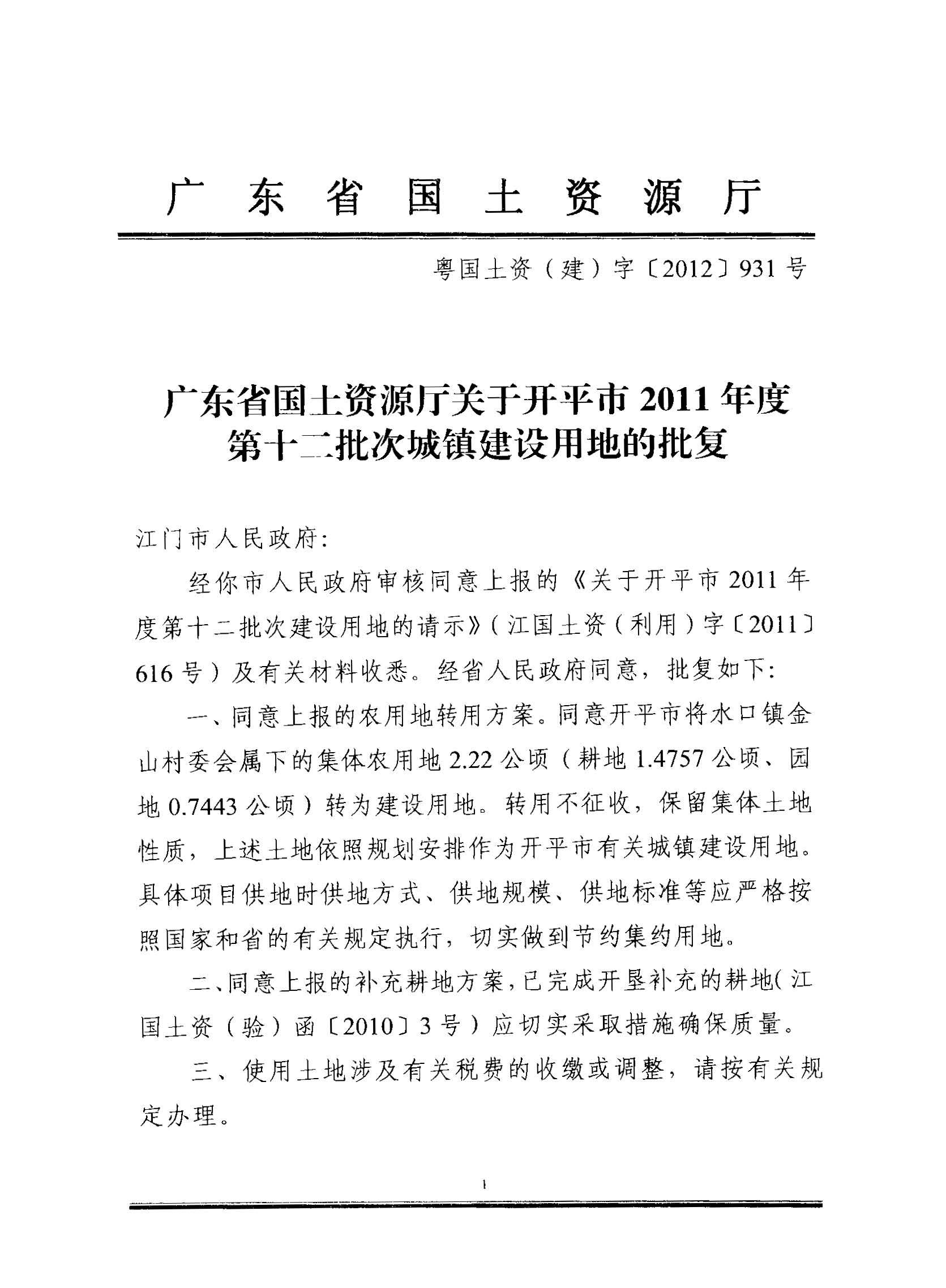 海棠直播 2011年度第十二批次城镇建设用地的批复