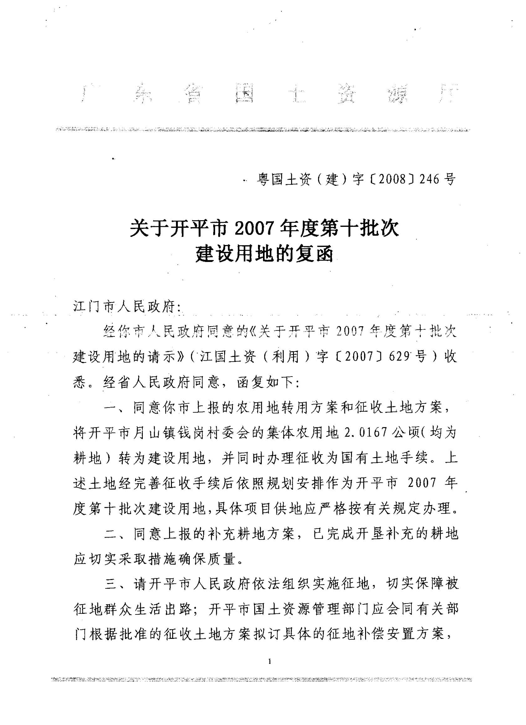 海棠直播 2007年度第十批次建设用地的复函