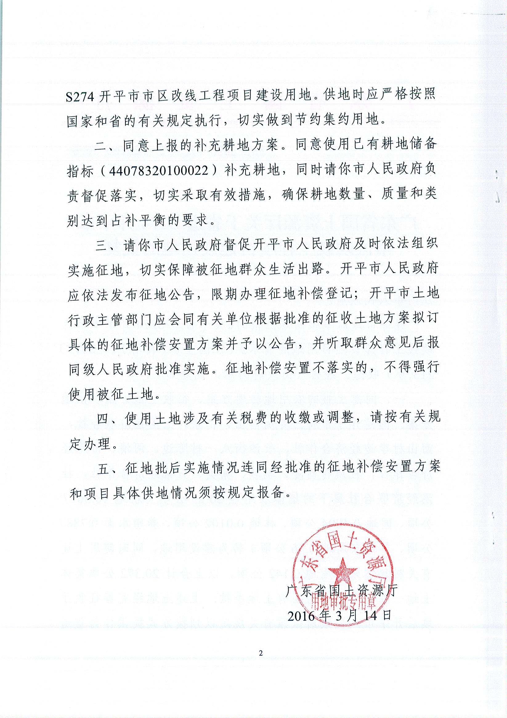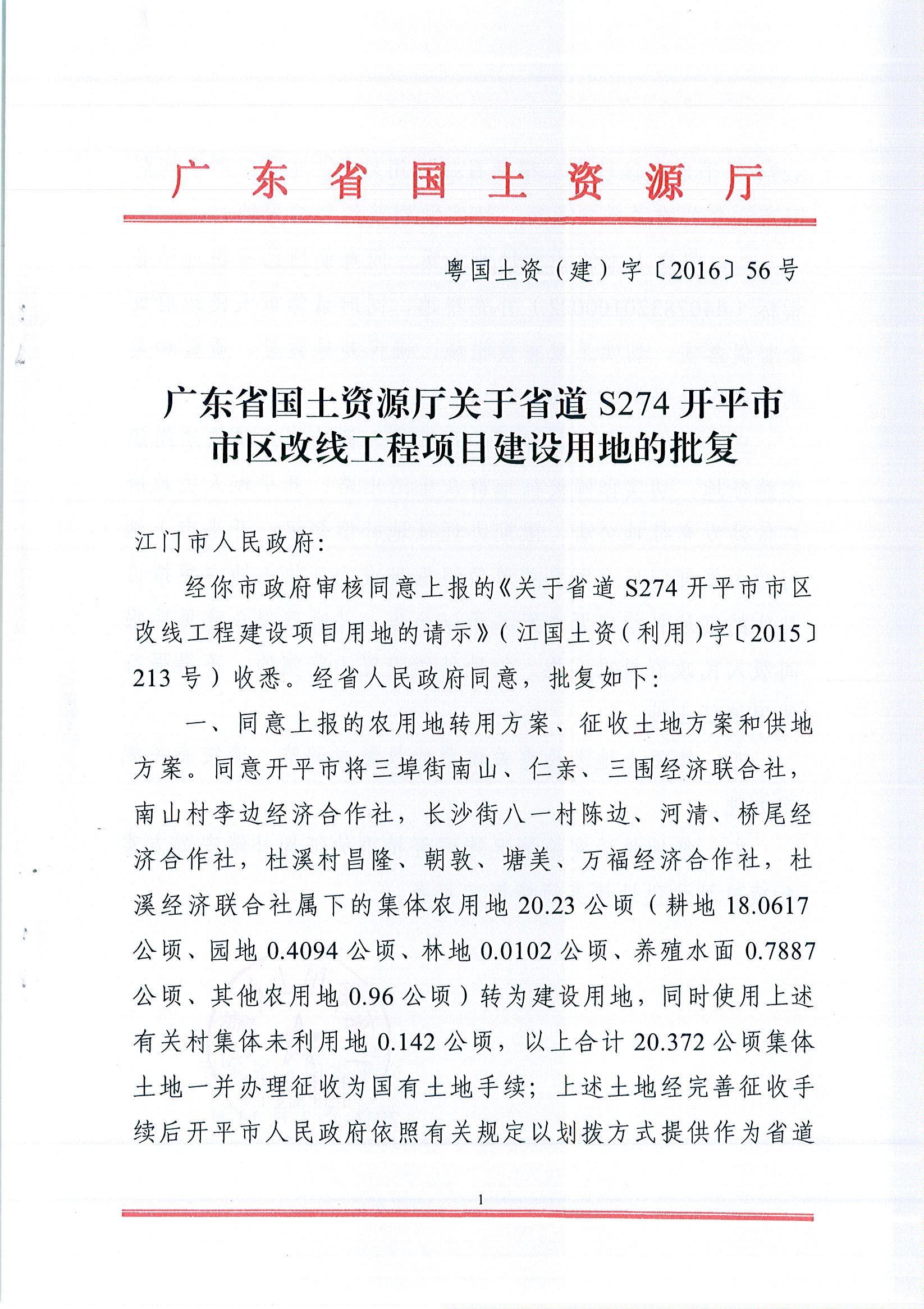 广东省国土资源厅关于省道S274海棠直播 市区改线工程项目建设用地的批复