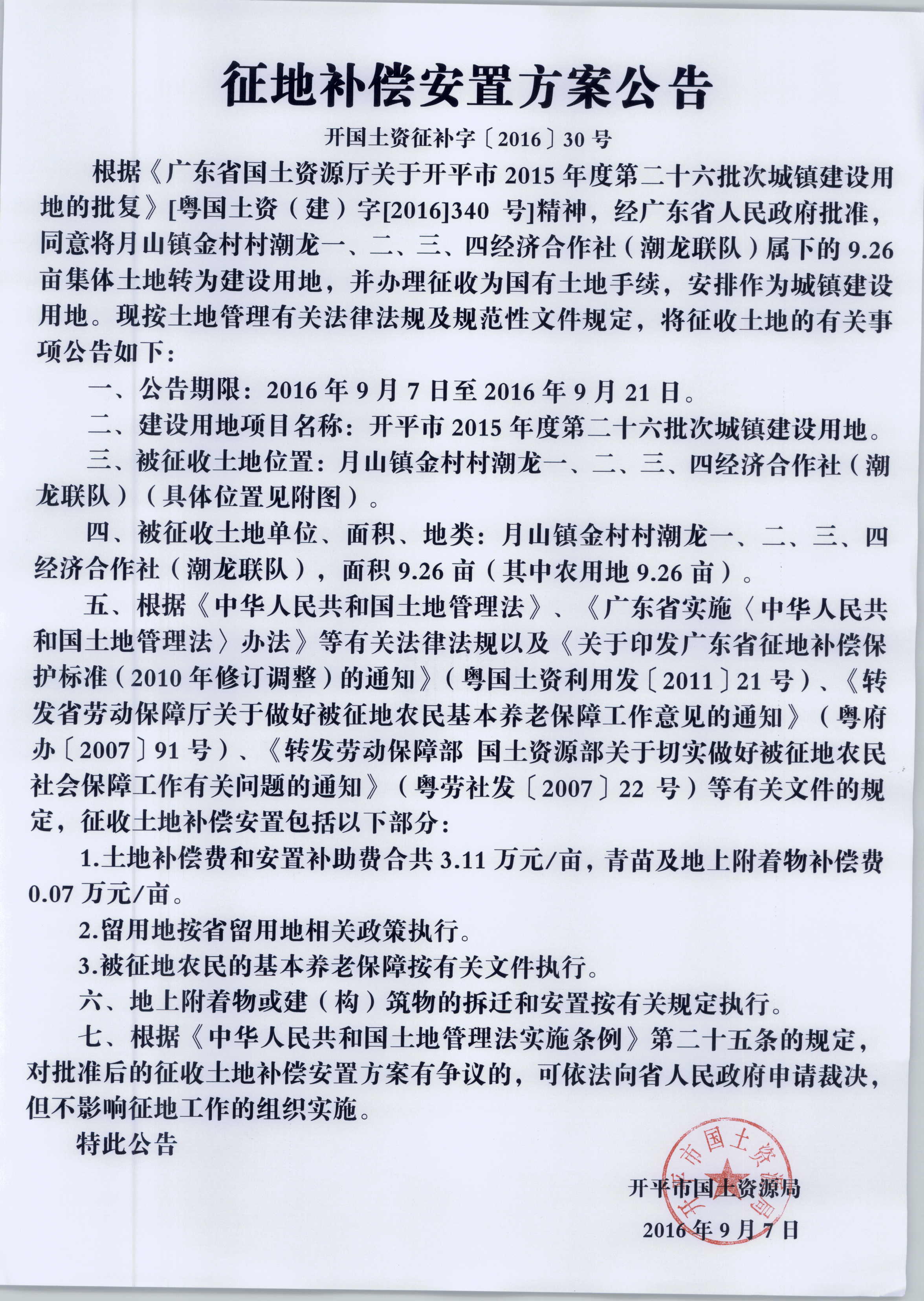 征地补偿安置方案公告(海棠直播 2015年度第二十六批次城镇建设用地)