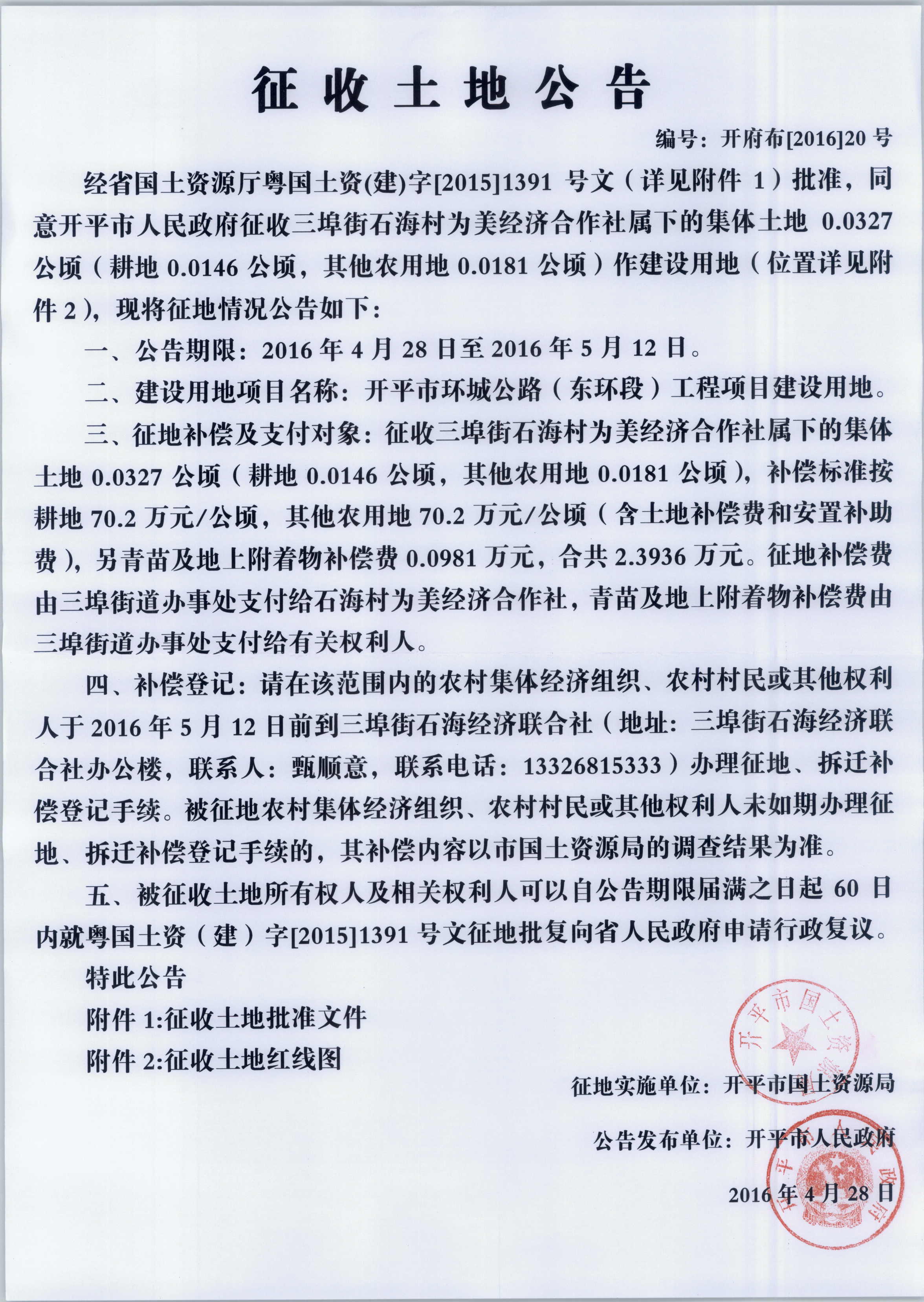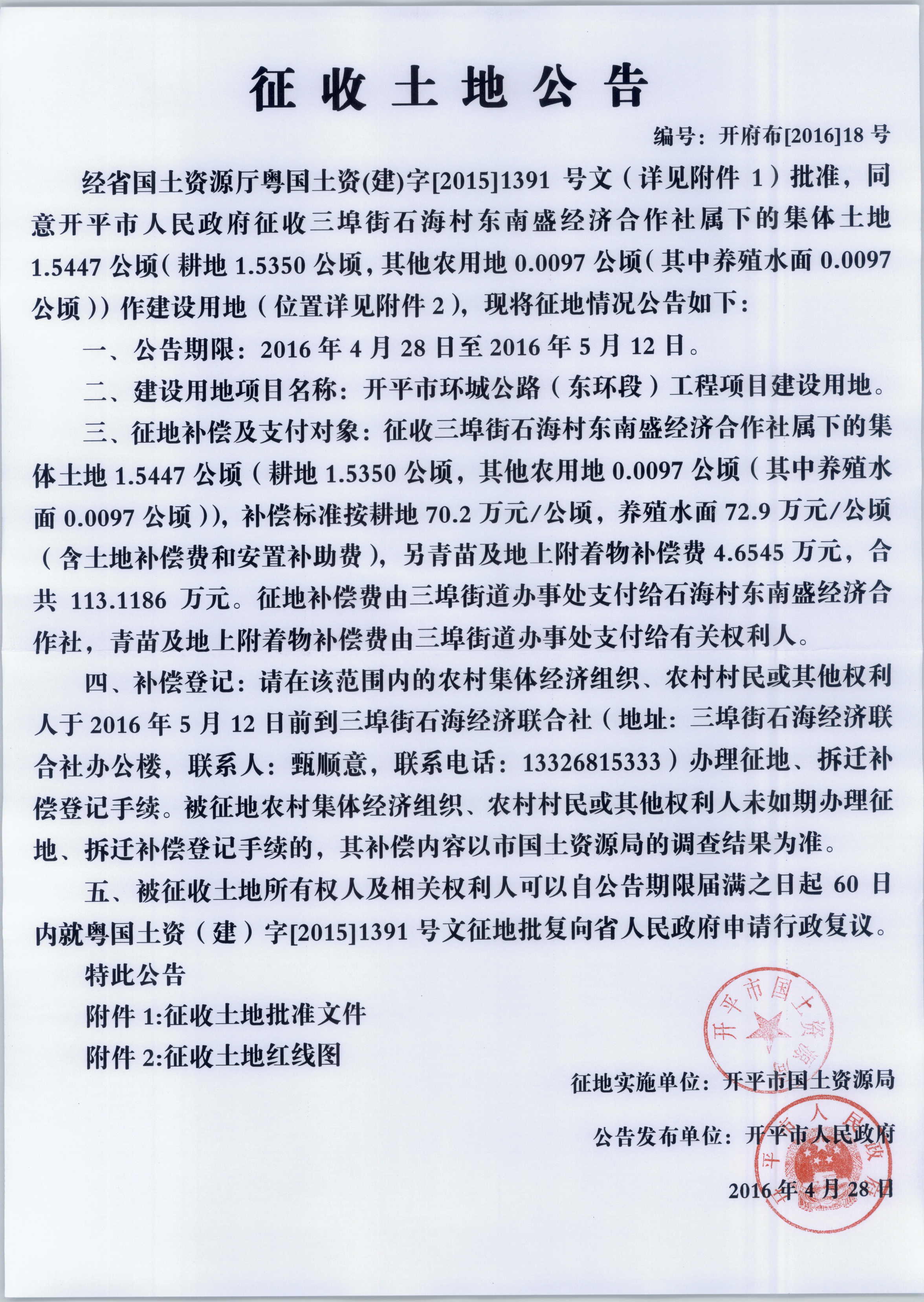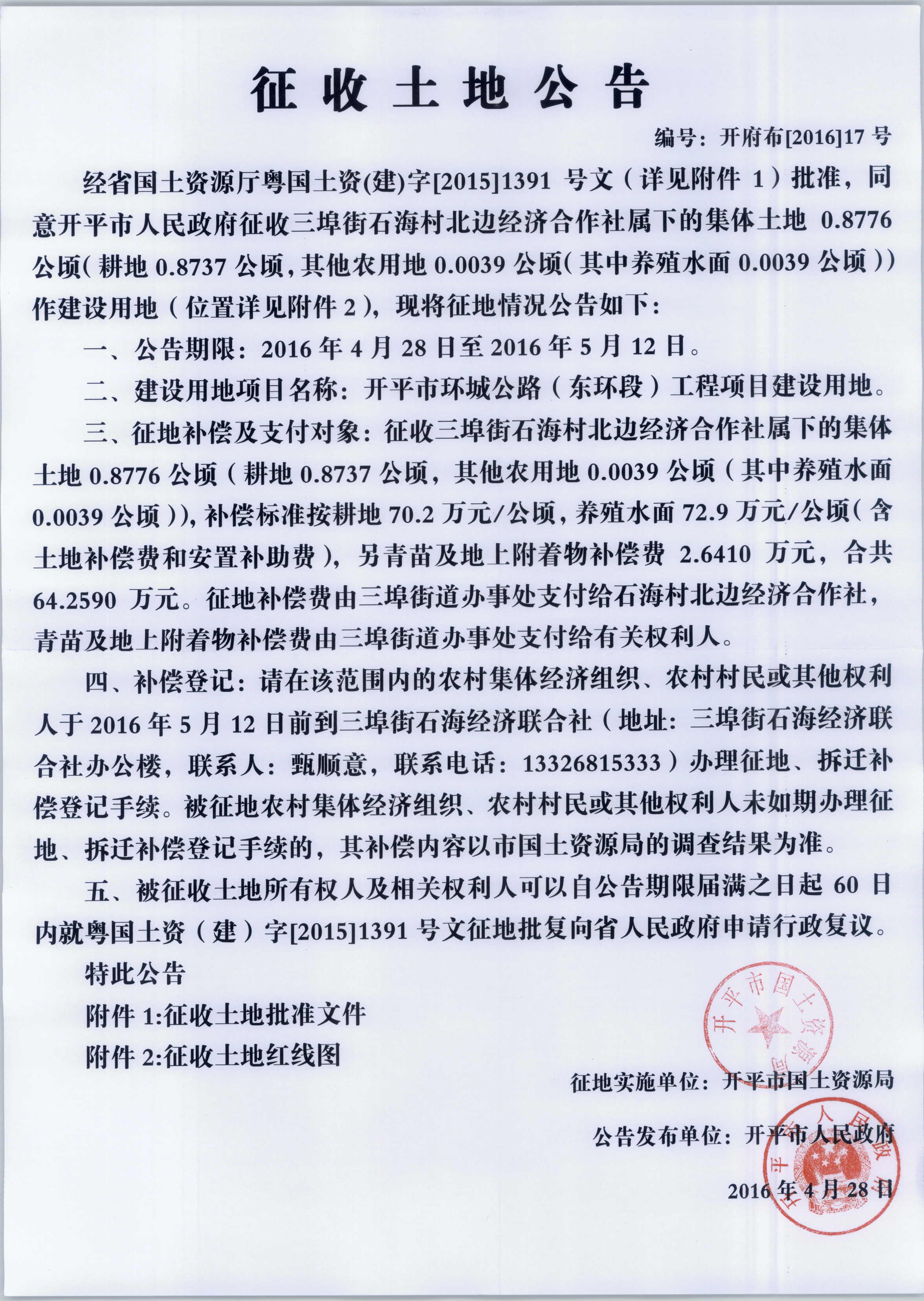 征收土地公告(海棠直播 环城公路(东环段)工程项目建设用地)