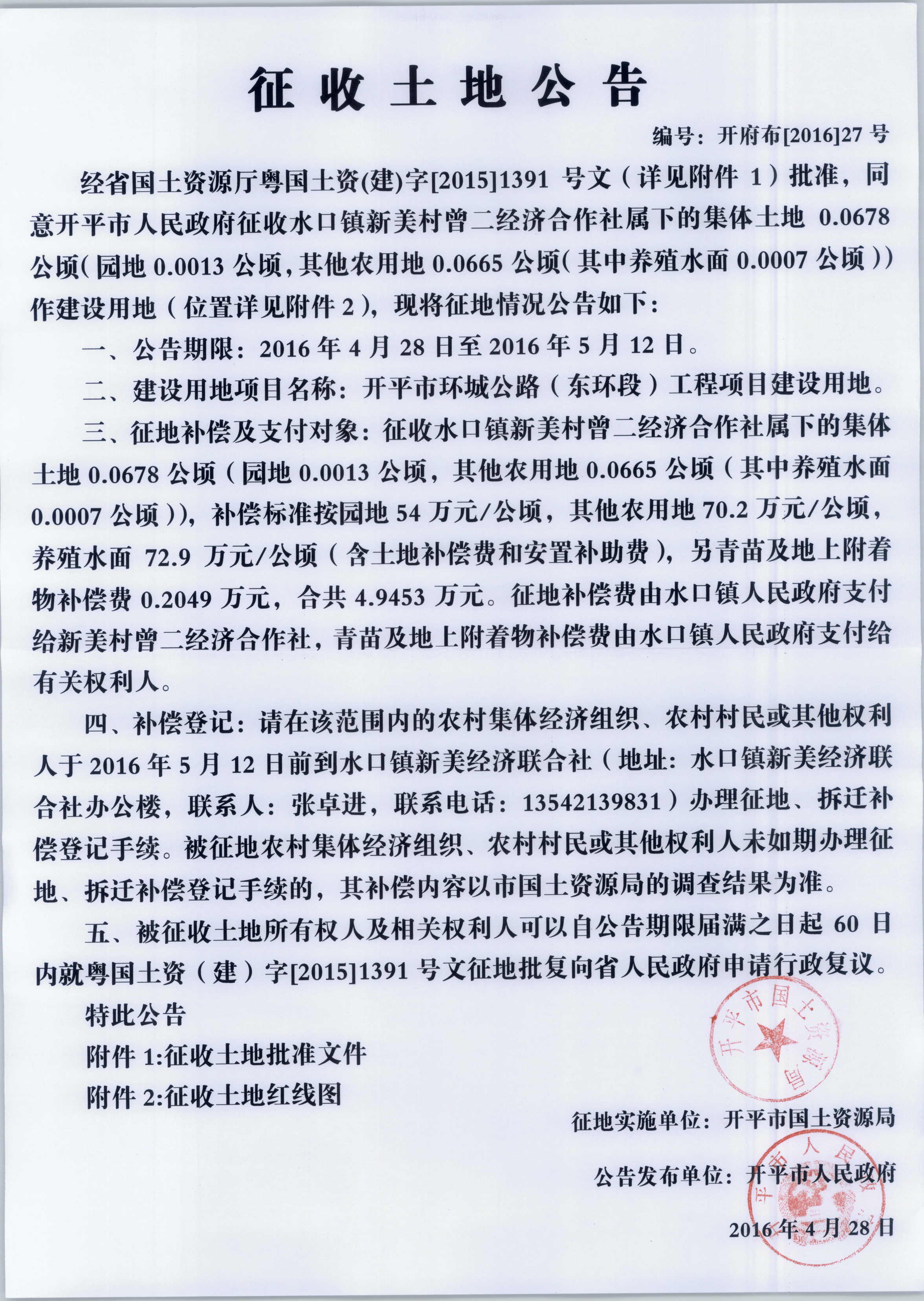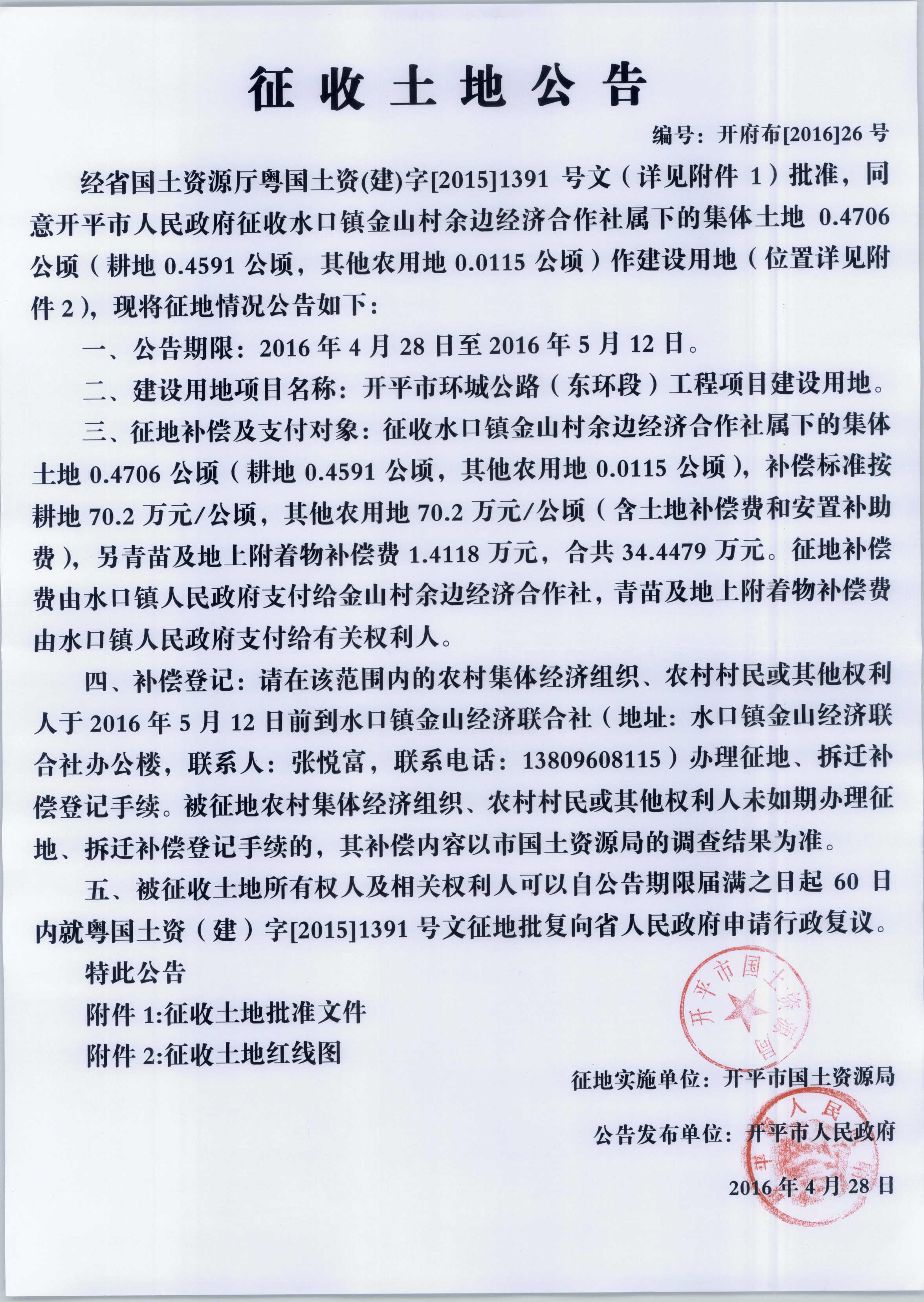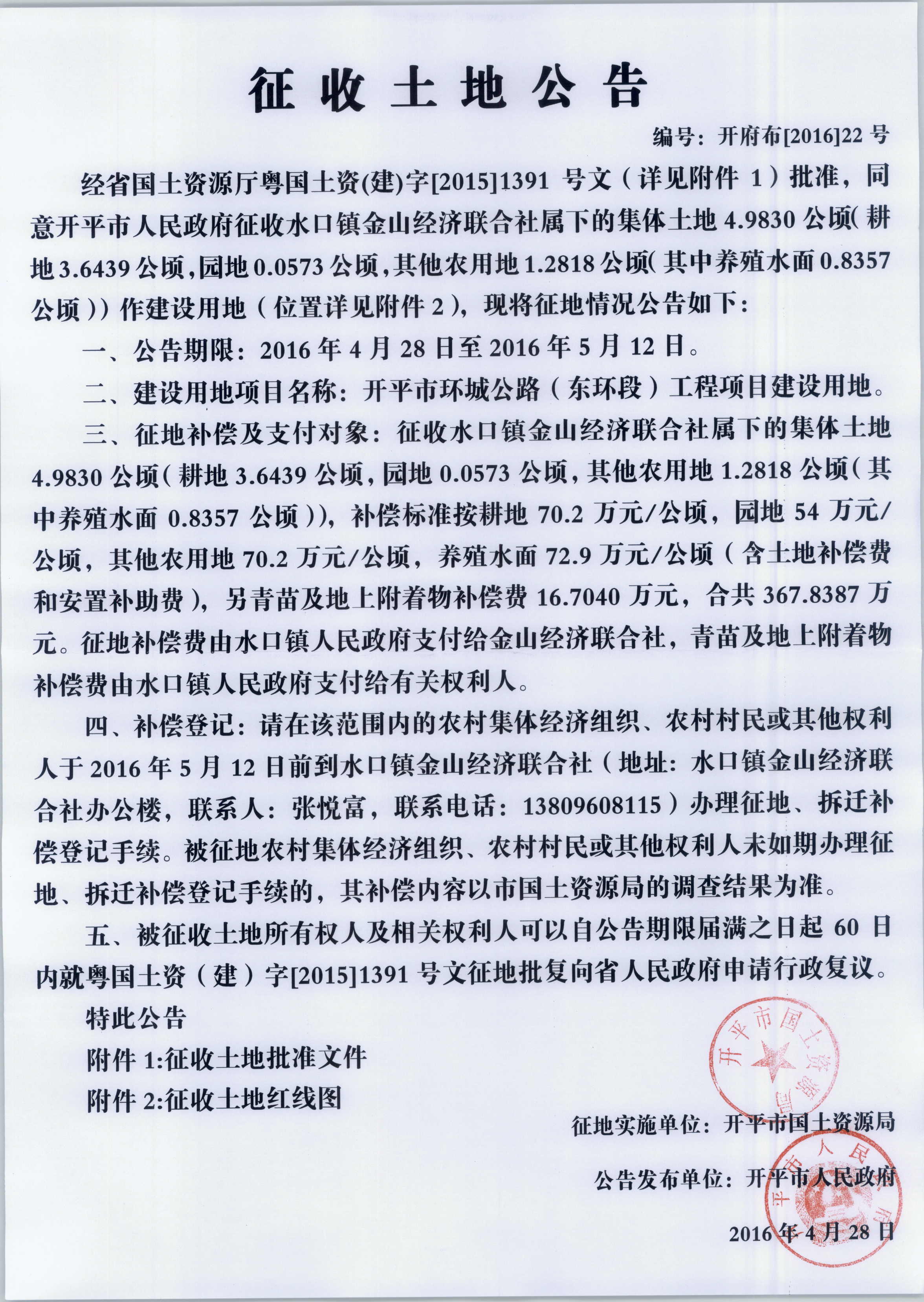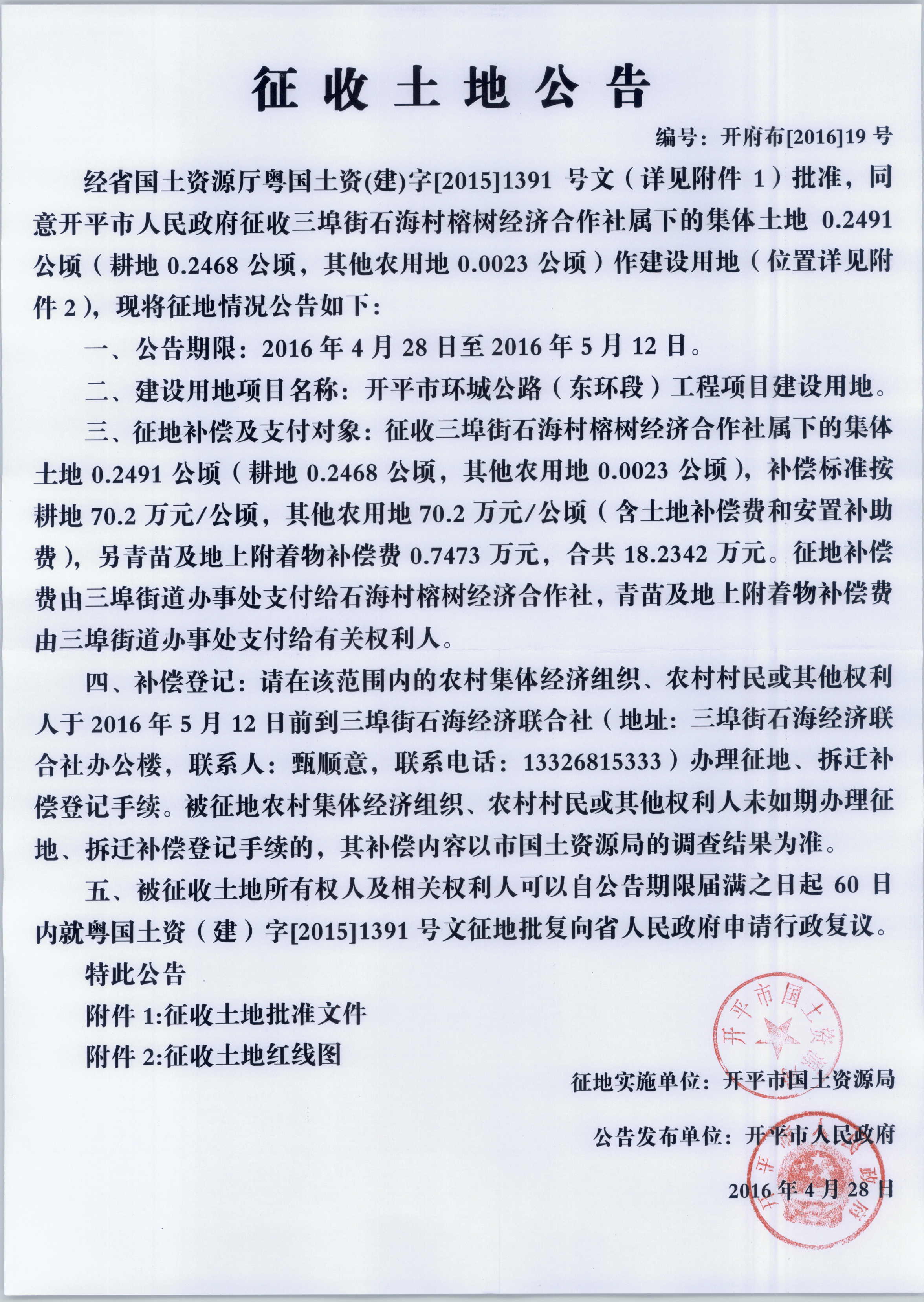 征收土地公告(海棠直播 环城公路(东环段)工程项目建设用地)