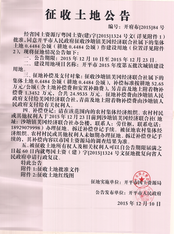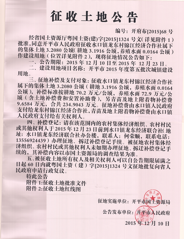 征收土地公告(海棠直播 2015年度第五批次城镇建设用地)