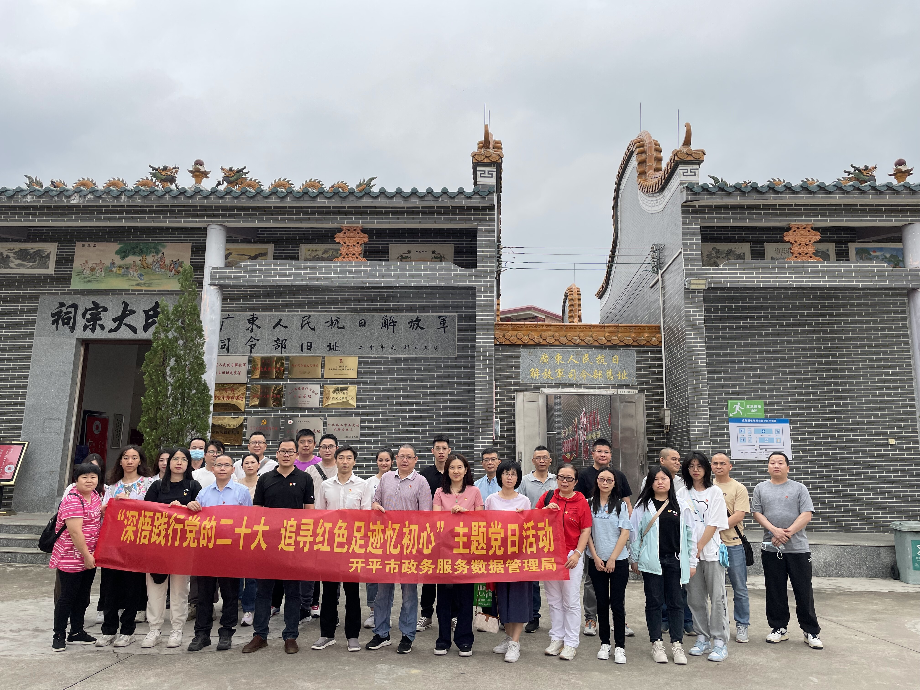 为深入学习贯彻党的二十大精神,创新党日活动形式,丰富党日活动内容,4月18日下午,开平市政数局机关党支部联合公共资源交易中心党支部开展“深悟践行党的二十大 追寻红色足迹忆初心”主题党日活动。 首先,组织全体党员干部集中学习党的二十大报告和《习近平关于党风廉政建设和反腐败斗争论述摘编》,进一步把全体党员干部的思想和认识统一到党的二十大精神上来,把智慧和力量凝聚到实现党的二十大确定的目标任务上来,推动党员干部思想认识进一步提高、工作作风进一步优化、务实清廉形象进一步树立。 随后,前往鹤山市宅梧镇的广东人民抗日解放军司令部旧址开展现场教学。在讲解员的细心介绍下,大家认真观看了展厅内陈列的图文史料,详细了解革命先辈浴血奋战的英勇事迹,从他们舍家为国、甘于奉献的崇高精神和坚定的理想信念中汲取奋进力量,进一步激发了党员的荣誉感、责任感和使命感,传承红色基因和革命精神。 通过接受红色精神洗礼,党员干部纷纷表示要进一步强化党性修养,坚定为党为人民矢志奋斗的理想信念,凝心聚力推动“数字政府2.0”建设,为开平百县千镇万村高质量发展工程作出政数贡献。